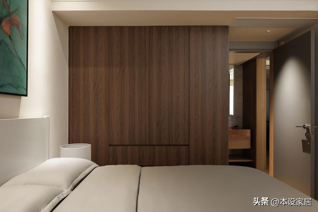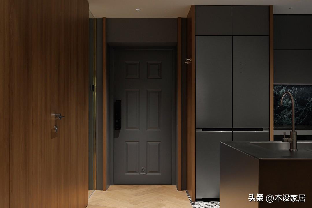 原有戶型沒有獨立玄關,順勢在沒有隔牆的次臥,定製了兩組背對背的到頂儲物櫃,朝玄關的櫃子滿足一家人進出門鞋靴、衣物和包包的收納需求,而朝次臥則是衣櫃,而隱形房門的設計,牆面看起來更加整潔,十分完美。