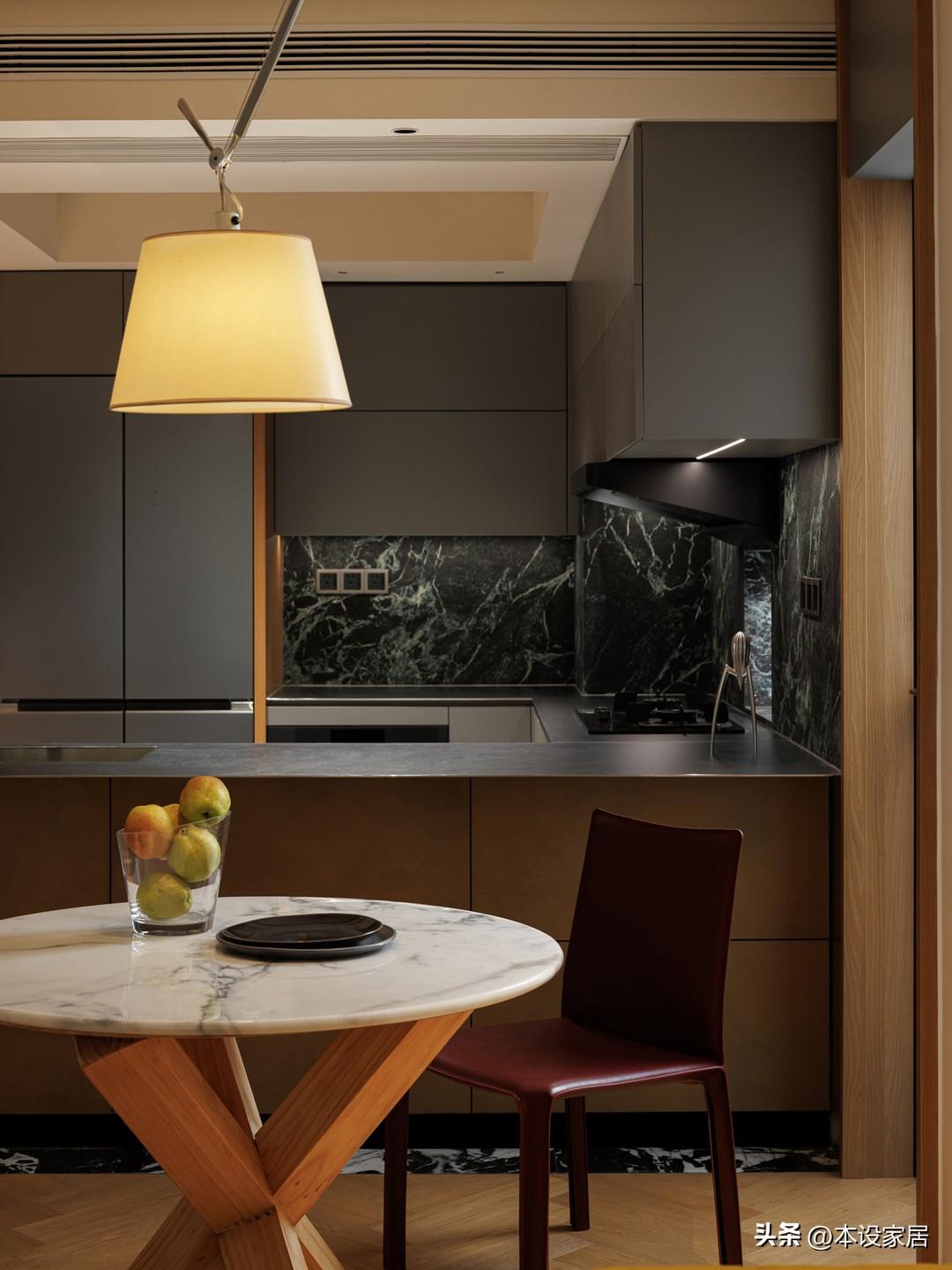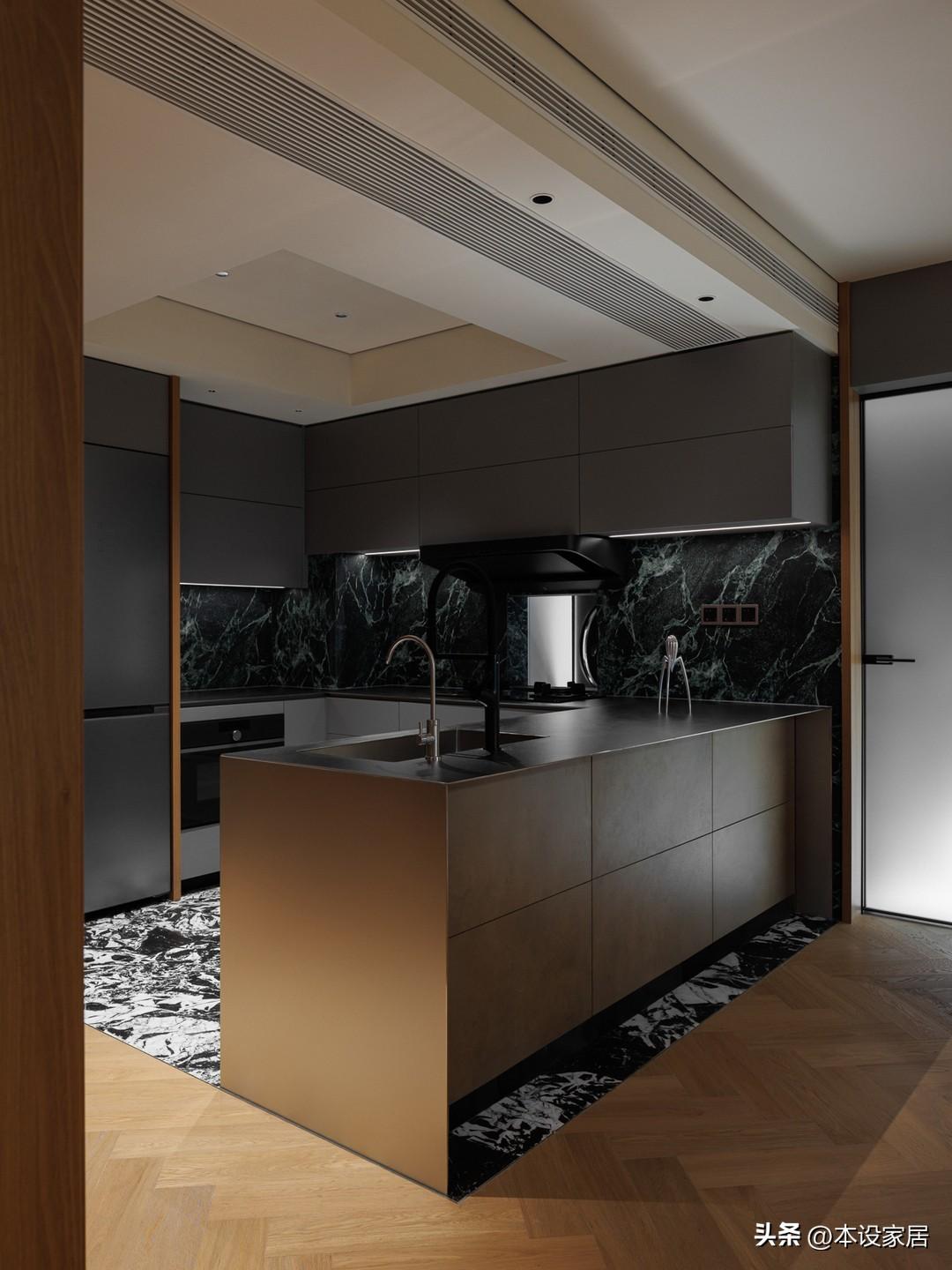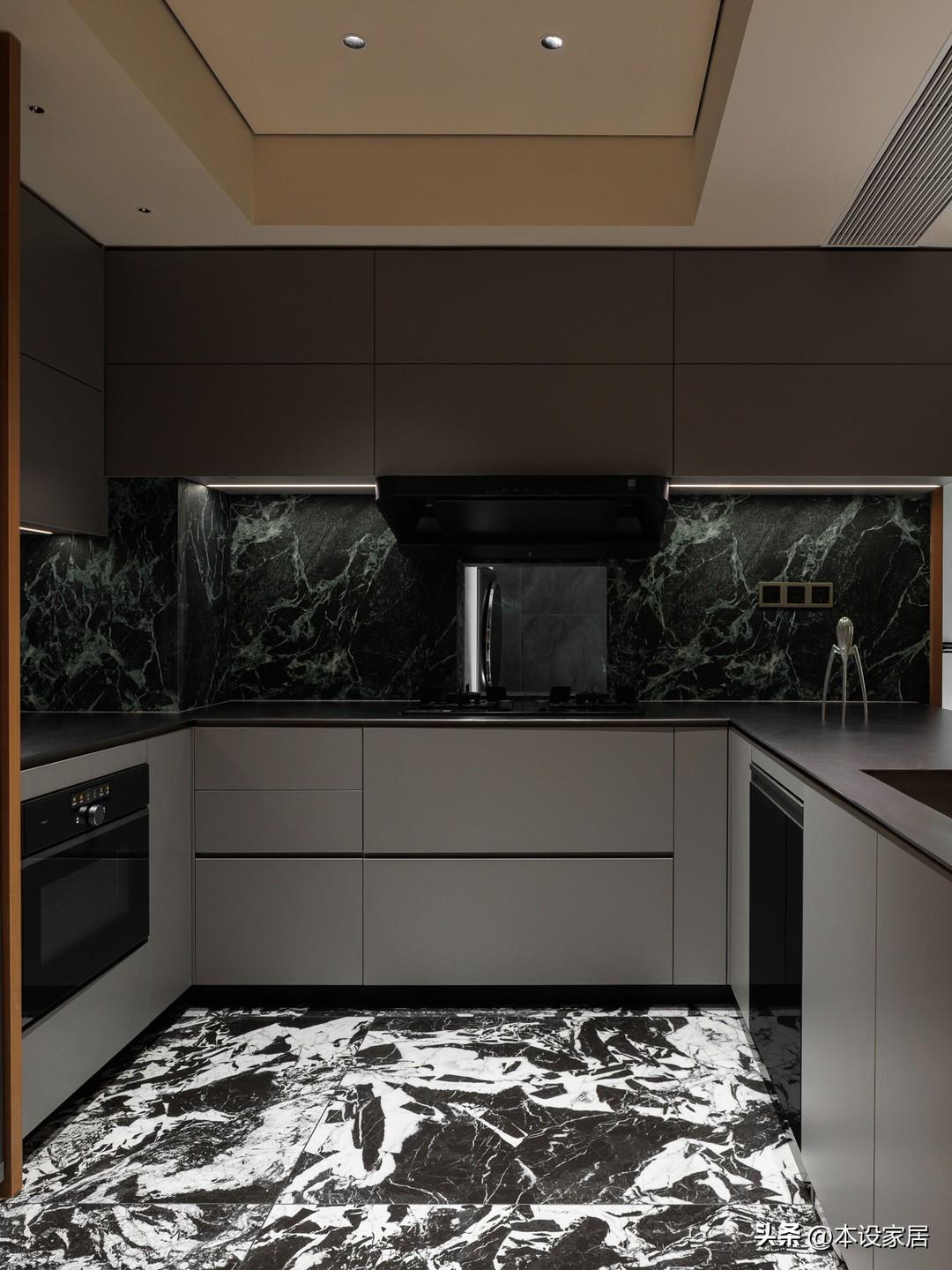 灰色的櫥櫃+島臺自帶靜謐感,搭配墨綠色和黑白紋理的大理石,帶來視覺衝擊的同時,也演繹出一場高級感拉滿的生活劇幕,不管是獨處,還是共聚,皆成詩章。