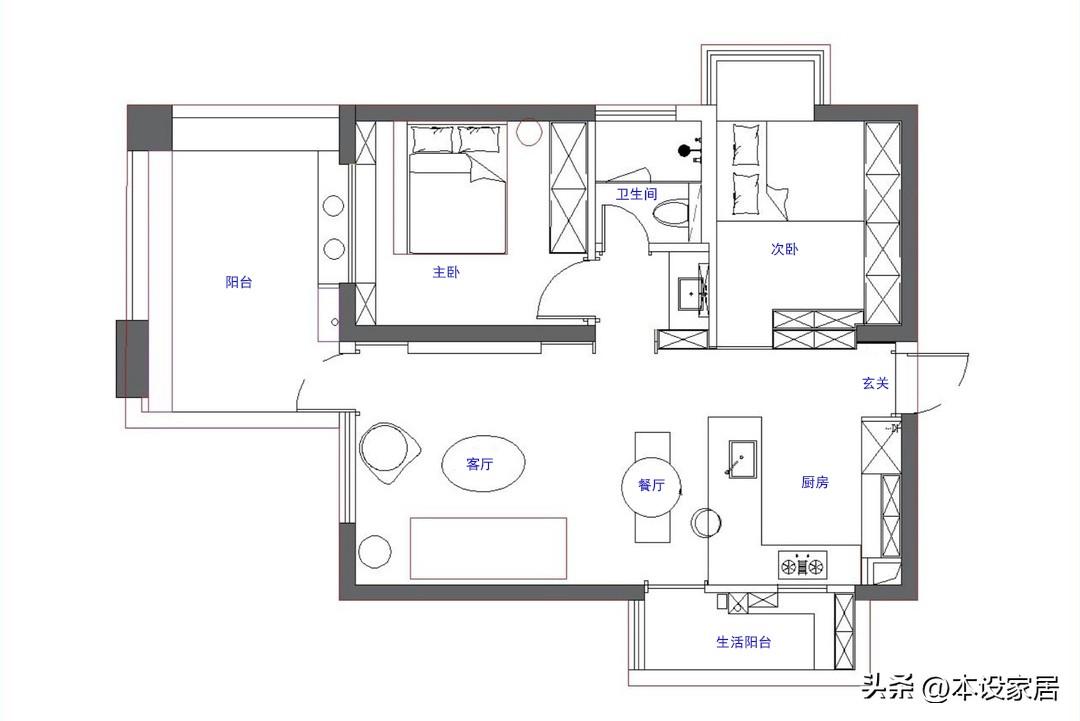 入戶門的左邊是客廳、餐廳和開放式廚房,右邊是臥室和衛生間,還配置了一大一小的陽臺,可以說功能齊全,動線清晰。
