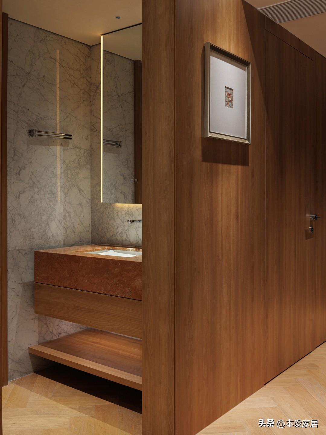 衛生間面積約4㎡,將洗漱臺外置實現乾溼分離,洗漱-洗澡-互不干擾,門的設計追求簡約視覺感,貼合個性化需求。
