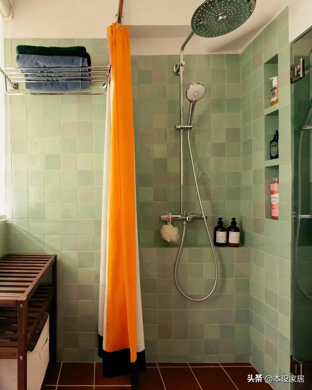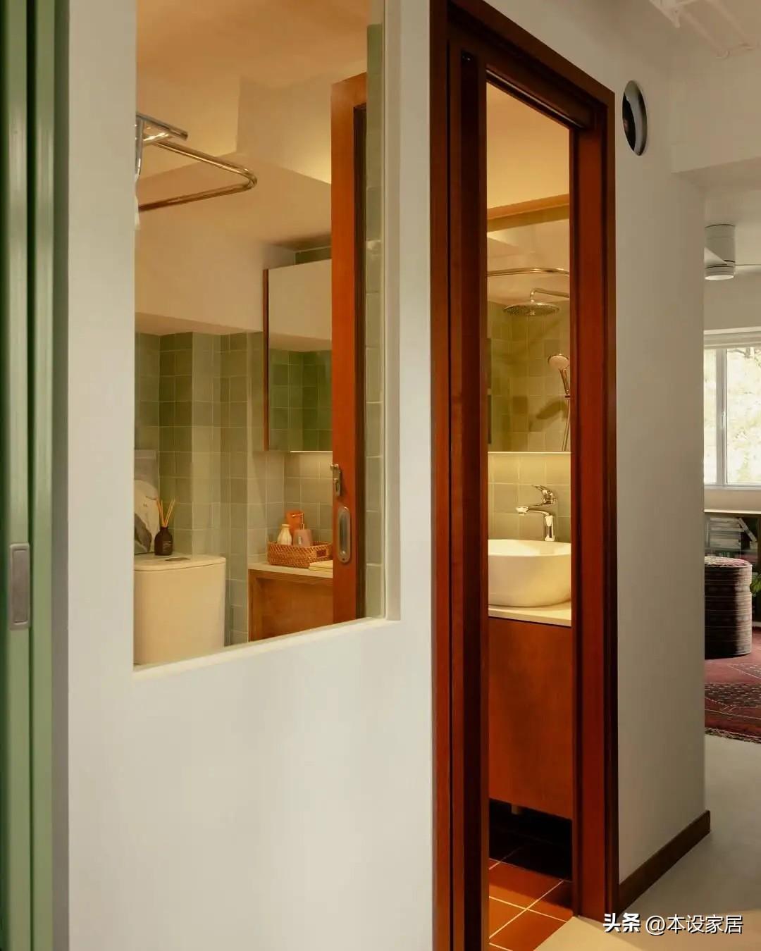 牆面滿貼綠色牆磚,每片深淺不同,與陽臺的移門形成呼應,在不經的轉身和回眸間都能發現不一樣的景緻。