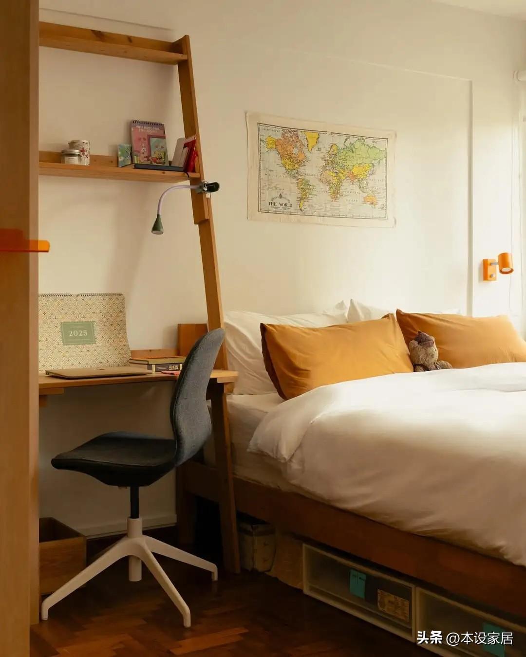 除了居中放置1.5米雙人牀外,左右牀頭櫃採用不對稱的佈局,左邊擺放的是一張造型簡約的實木桌子,這裏既是梳妝檯,也是寫字桌,在無數個寧靜的夜晚,Sara都在這裏孜孜不倦的學習和備課。