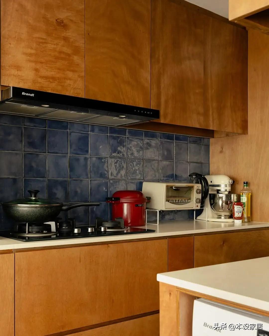 地面鋪設赭石色瓷磚,搭配原木色櫥櫃和藍色牆磚,形成了有序的節奏韻律,在這樣溫暖的空間中製作美食,很難不產生一種如夢似幻的情愫。