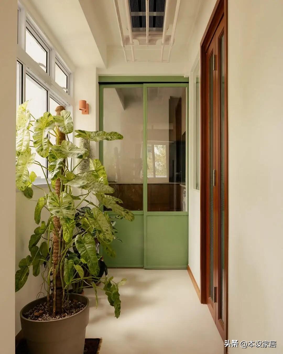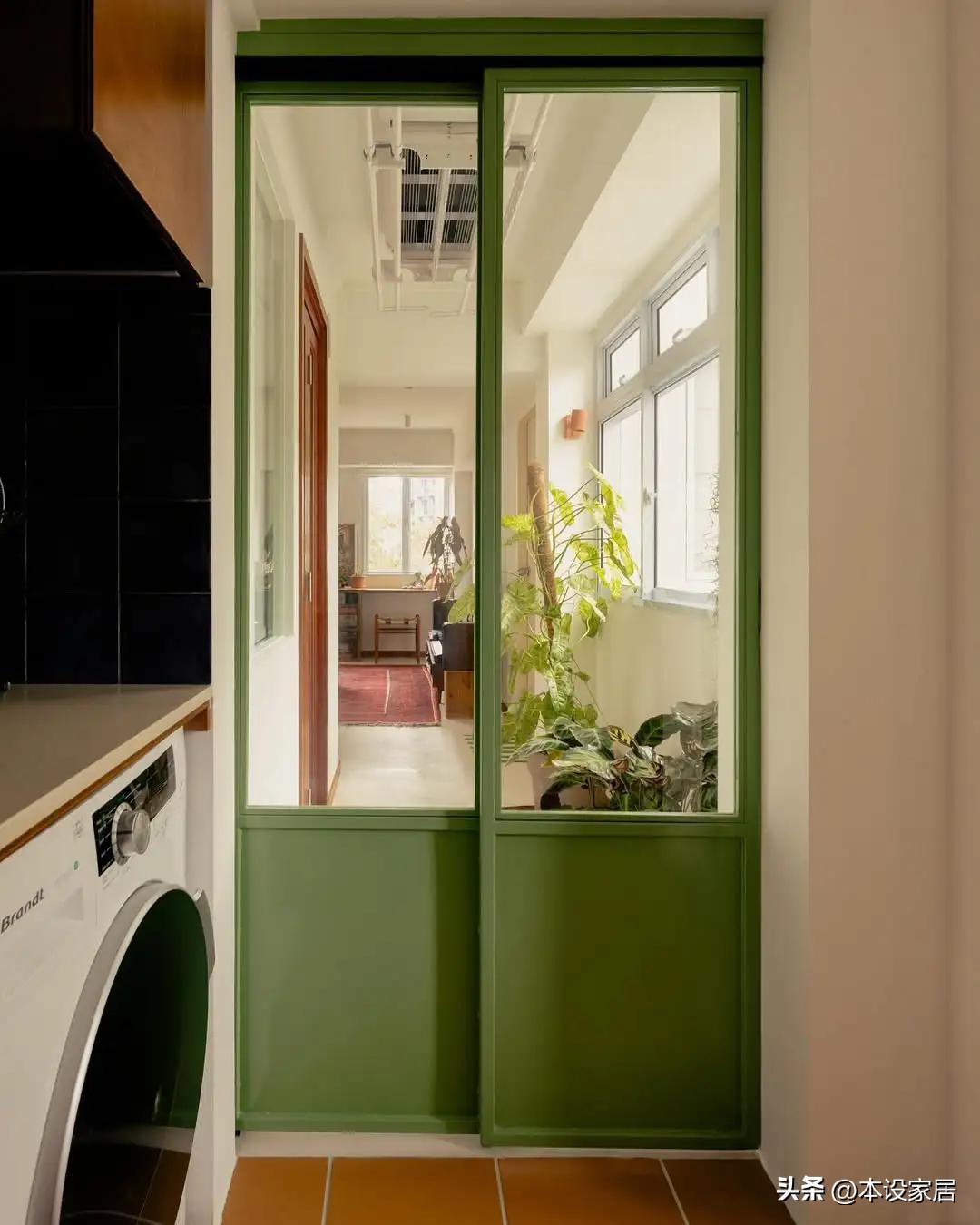 廚房與陽臺之間安裝一道草綠色鋼框+玻璃的移門,天氣晴好的日子,還可以把洗好的衣物拿到陽臺晾曬,不管置身地球的哪個地方,陽光的味道沒人能拒絕。