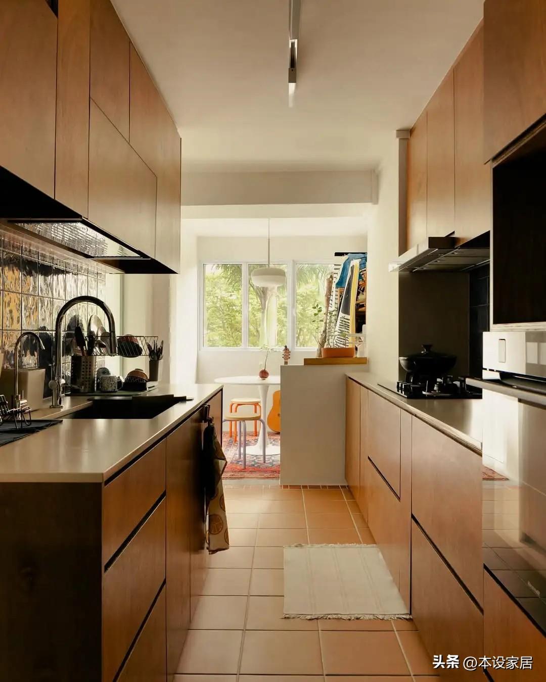 長條形的廚房裏,採光比較好,得益於拆除了與生活陽臺的隔牆,並佈置了一組白色小桌,喫個早餐非常方便。