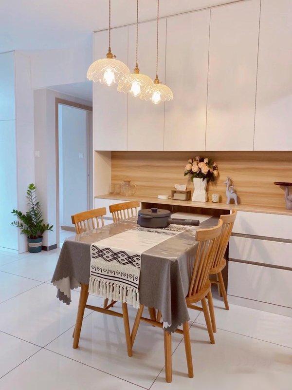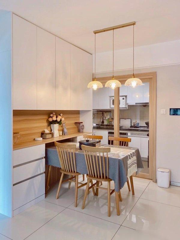 餐廳的餐邊櫃也絕,特意留了兩個空位:一個放酒水飲料,一個留着插插座——現在不是流行“餐桌留白”嗎?老人直接把“必須存在但不好看”的東西塞進餐邊櫃,餐桌就留着放碗碟,喫飯的時候看着乾淨,連食慾都變好了。