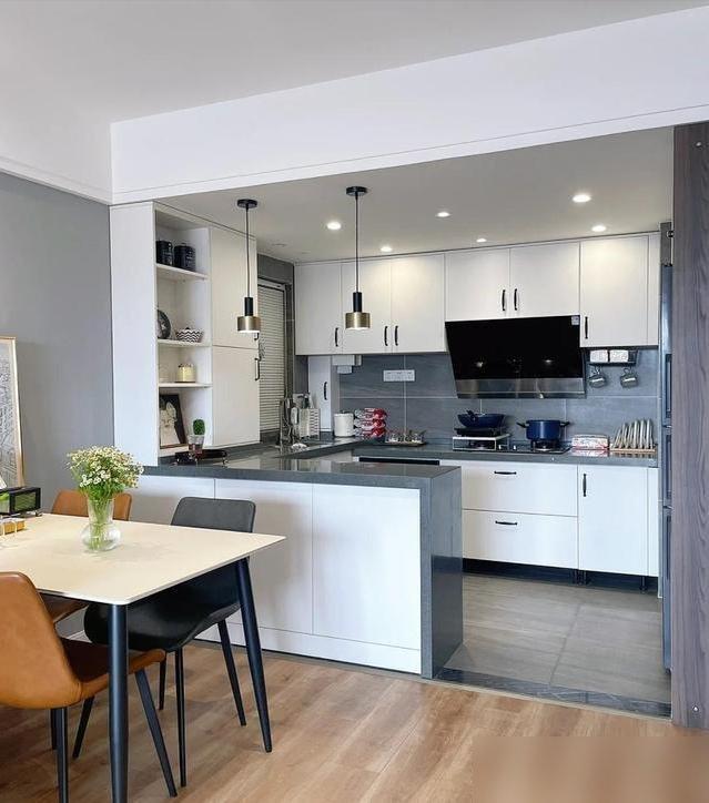 開放式廚房+吧檯簡直是年輕人的“社交密碼”!做飯時能跟客廳的人聊天,炒個菜還能喊“幫我遞瓶醬油”,比關着門做飯熱鬧多了;吧檯既能當早餐桌,放杯牛奶、一片面包就能解決早八,也能當酒櫃,週末跟對象站着喝杯紅酒,比坐在餐桌前“正式喫飯”更放鬆。