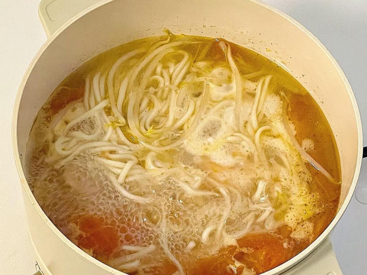 在電煮鍋的內膽加水,約半鍋的水量,選擇火鍋模式的最大火力。在水沸騰後,放入麪條,然後用筷子輕輕攪散,麪條不要攪在一起。