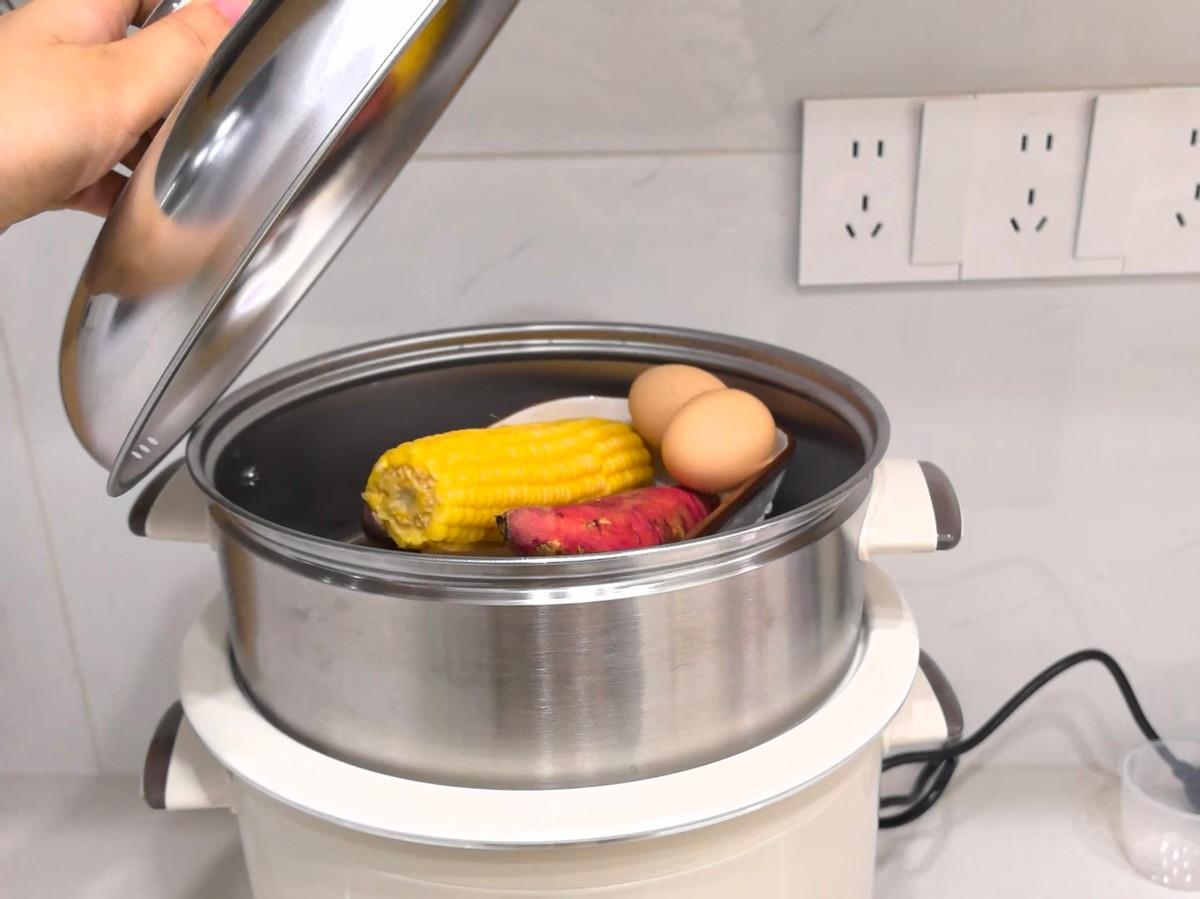 只需要將內膽加水約200毫升,放上蒸格。例如在左邊放包子,中間放雞蛋,右面可以放玉米,蓋上鍋蓋,選擇蒸煮模式,定時15分鐘。