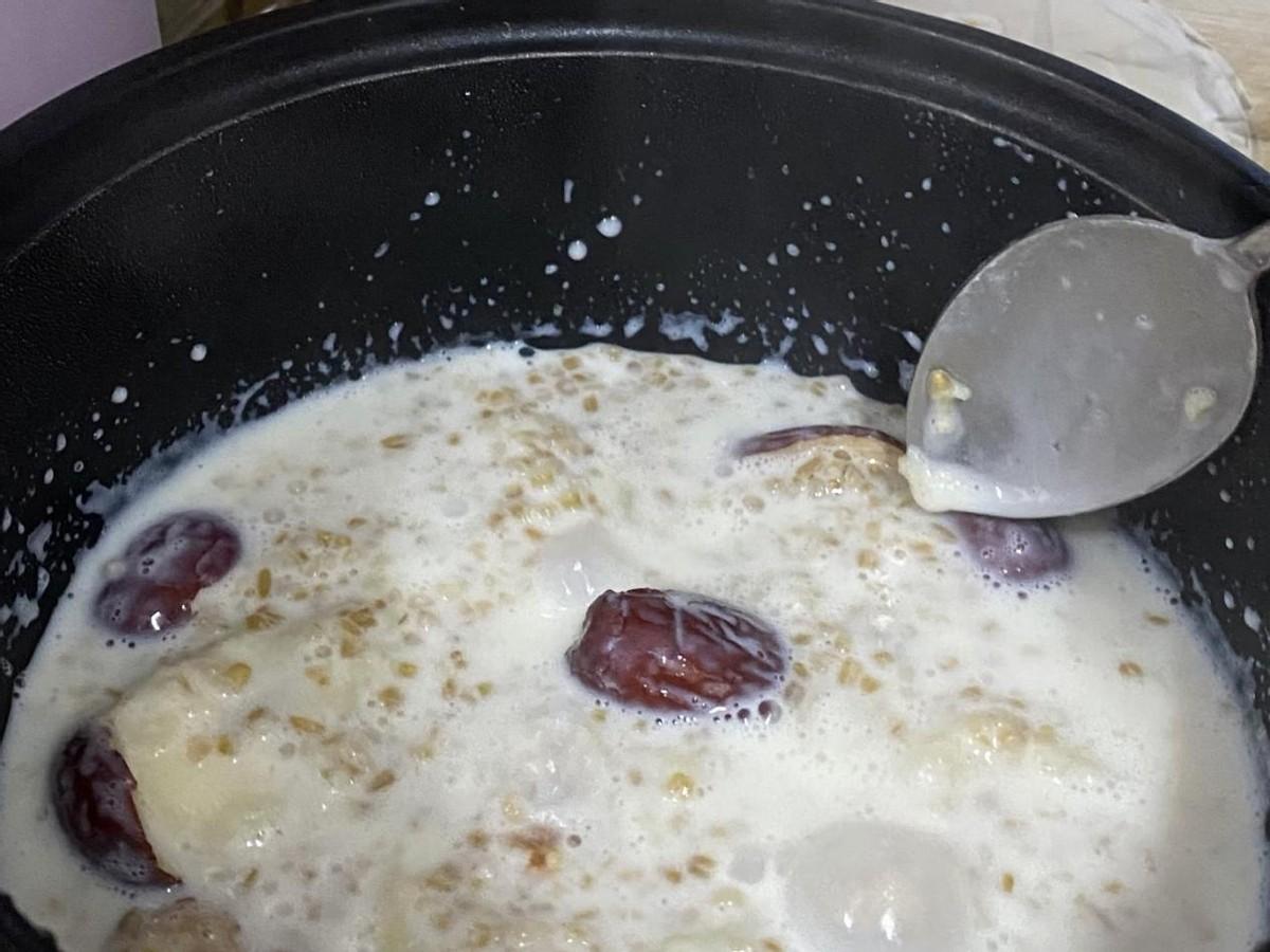 臨睡前,我們只需要在電煮鍋的內膽中加入燕麥片和牛奶,比例大概是1:3,然後加入少許的食鹽,放點堅果和乾果調味。