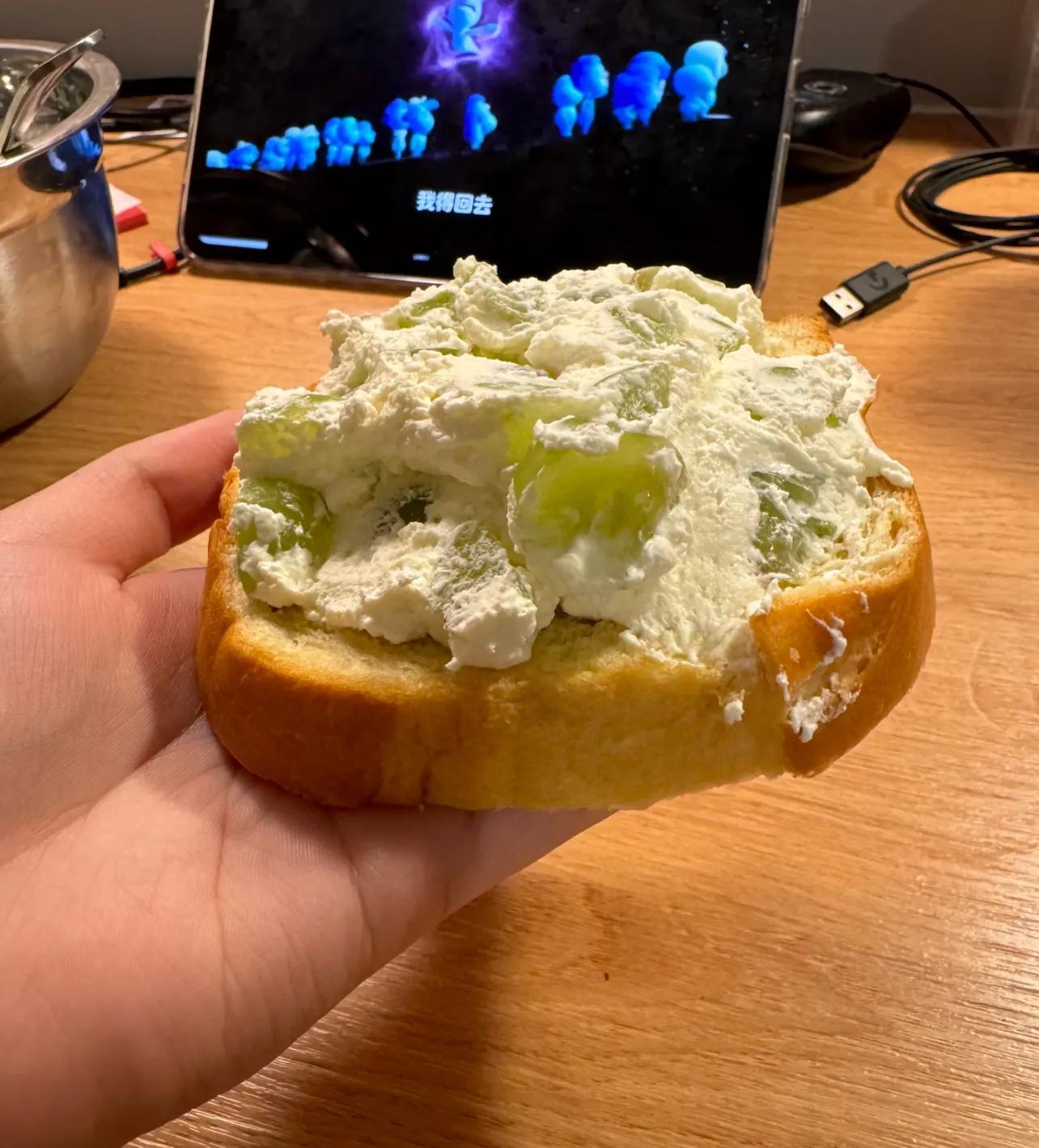 謝天謝地,那個飯終於翻篇了!這個就清爽多了,來自住友@去薯條整點碼頭,半夜靈機一動的糊弄飯:奶油+葡萄堆麪包片。