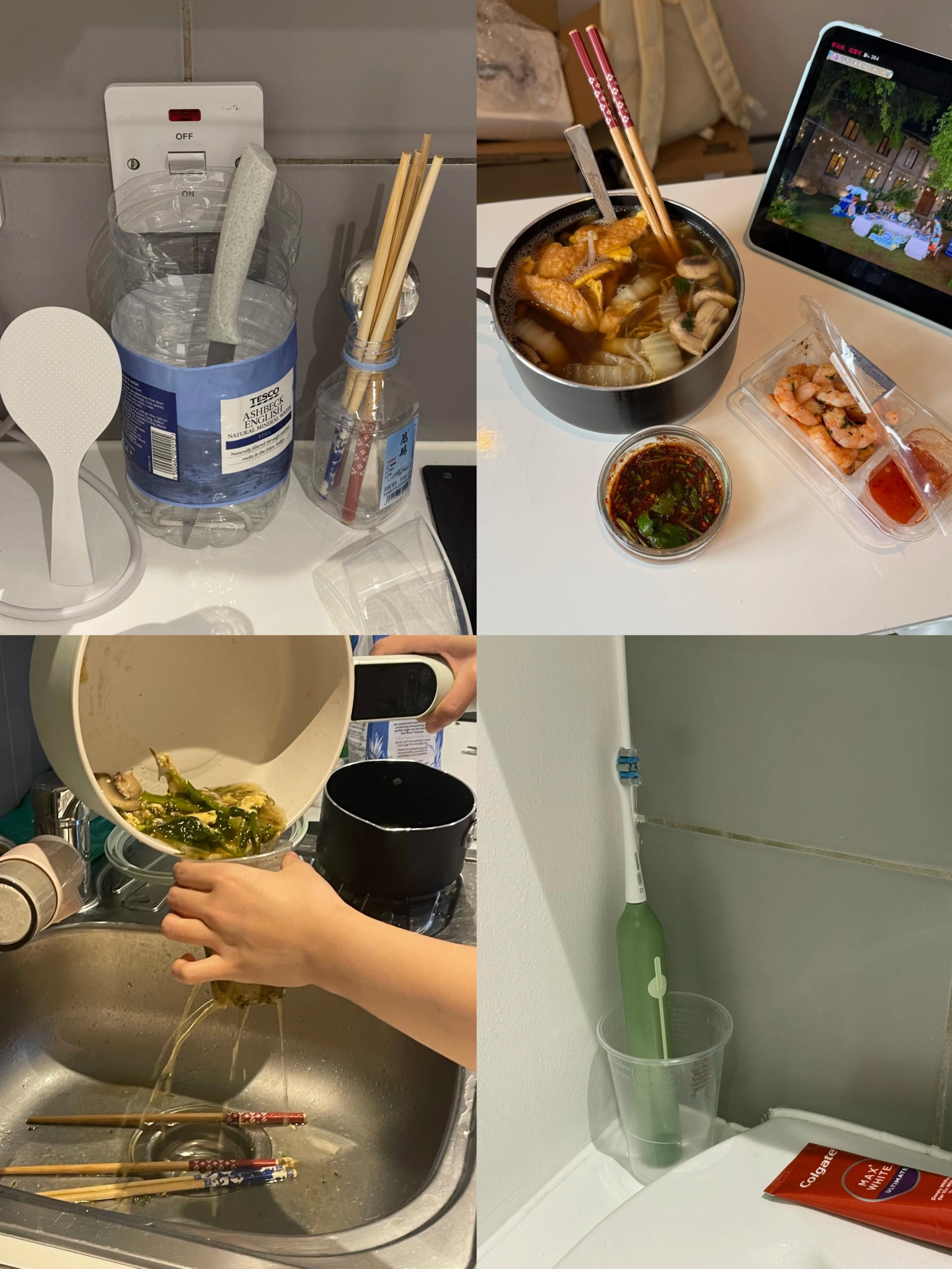 她甚至只有一把刀,都不用做前面那種刀架,和筷筒都用礦泉水瓶一改;布丁盒子當蘸料碗;麻辣燙店薅來的一次性水杯,這邊一個漱口,那邊一個濾渣;
