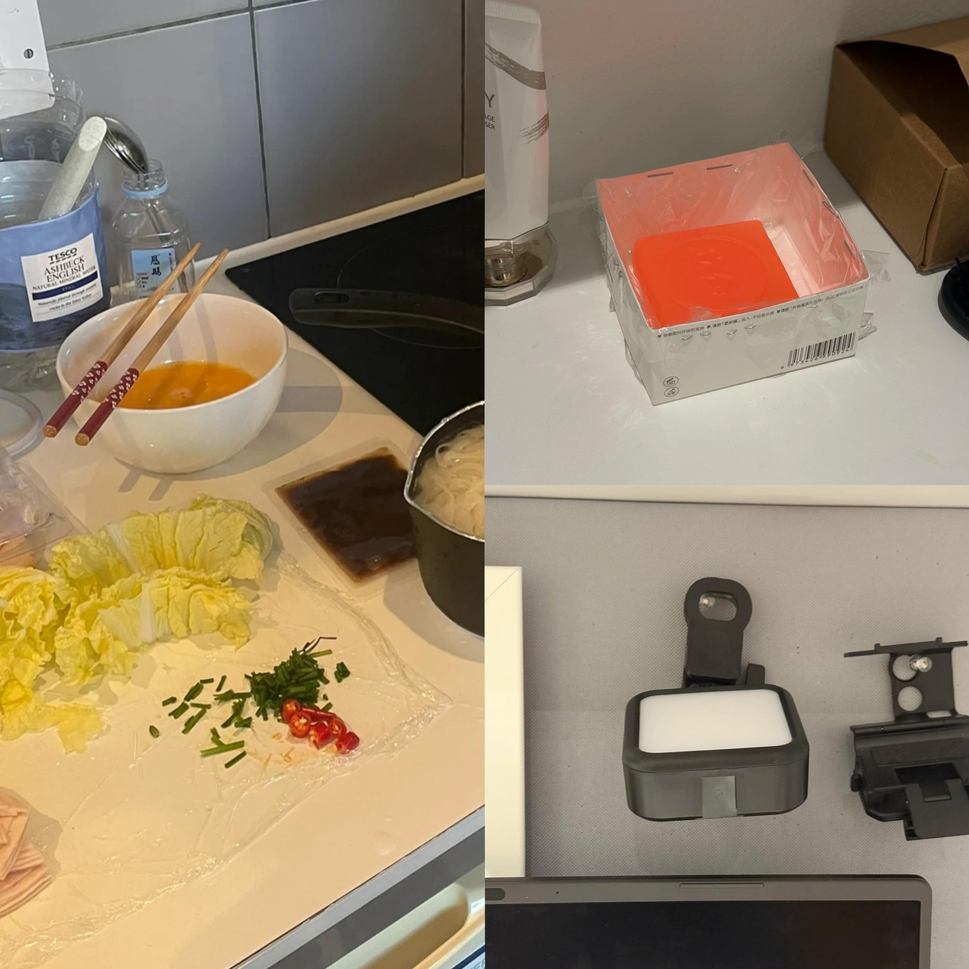 保鮮膜鋪開就是菜板,包裝盒加層塑料膜就是香皂盒,拍照的補光燈還能兼職檯燈。真摳啊,也是真厲害!