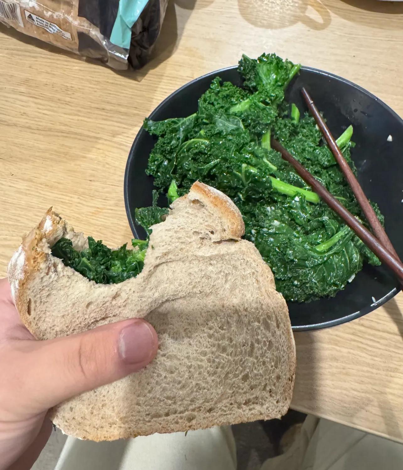 但瘋得最有信念感的還得看住友@Dirsch,一點草,外賣18刀,果斷自己羽衣甘藍夾麪包,簡簡單單又一餐。
