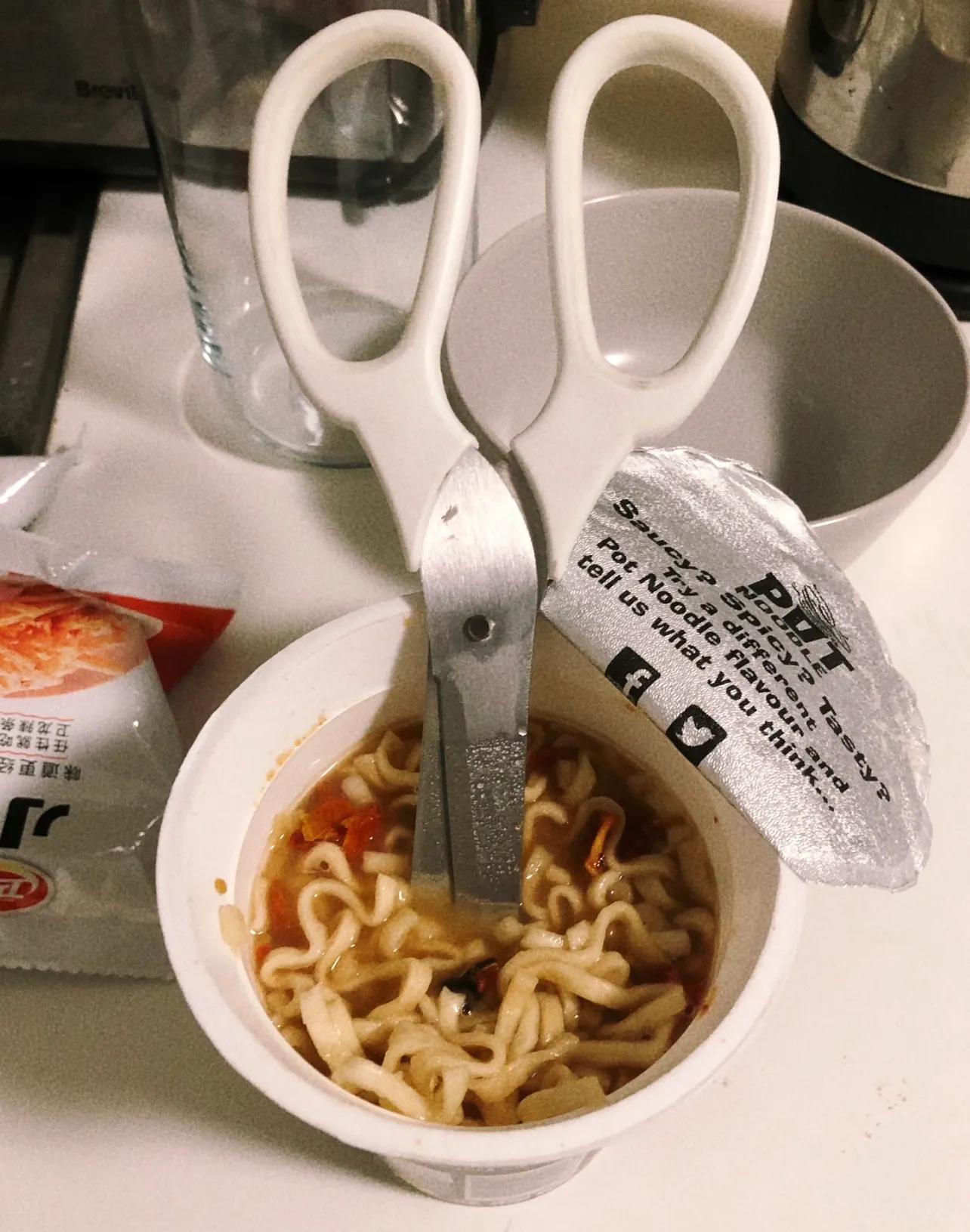 等飯做好了輪到喫的時候,一時半會沒買餐具,直接用剪刀搞定,牙刷也行,真是精神可佳……