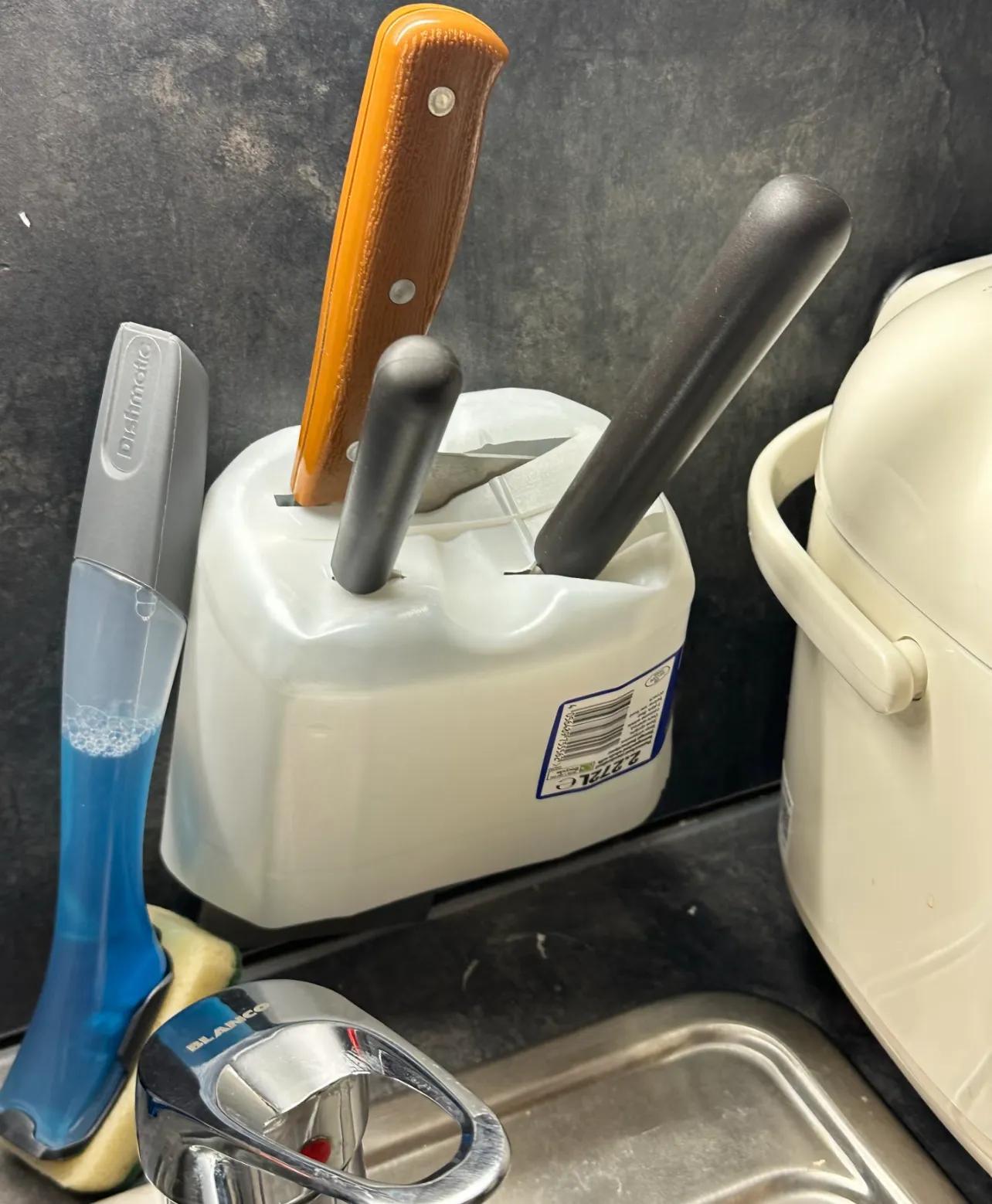 牛奶盒子裁開,劃拉幾個刀口,再用納米膠一固定,把刀插進去即刻上崗!