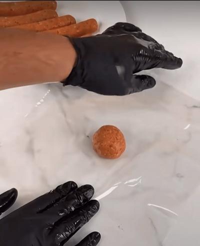 先在袋面上塗上油,再將肉餡放上去,對摺袋子,用刮板從外往裏輕輕一擠,一根粗細均勻的“手工香腸”就做好了。