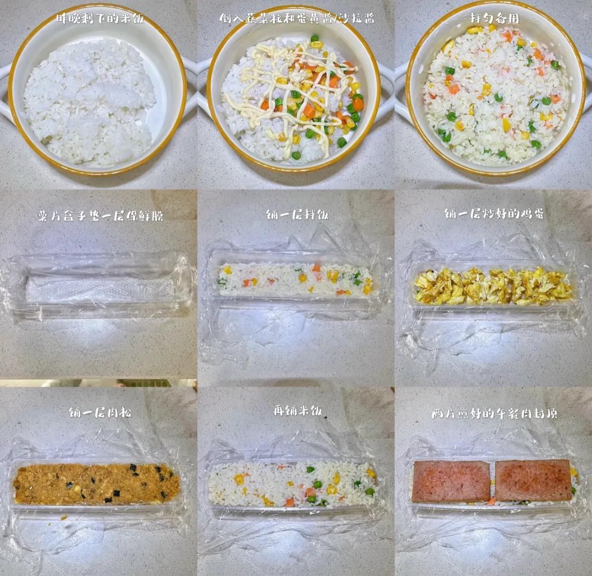 給薯片盒裏的塑料槽,鋪一層保鮮膜,然後將米飯、胡蘿蔔、黃瓜、火腿等食材。