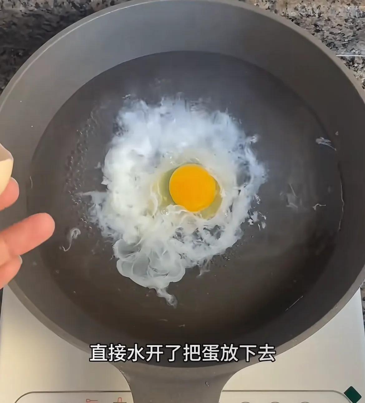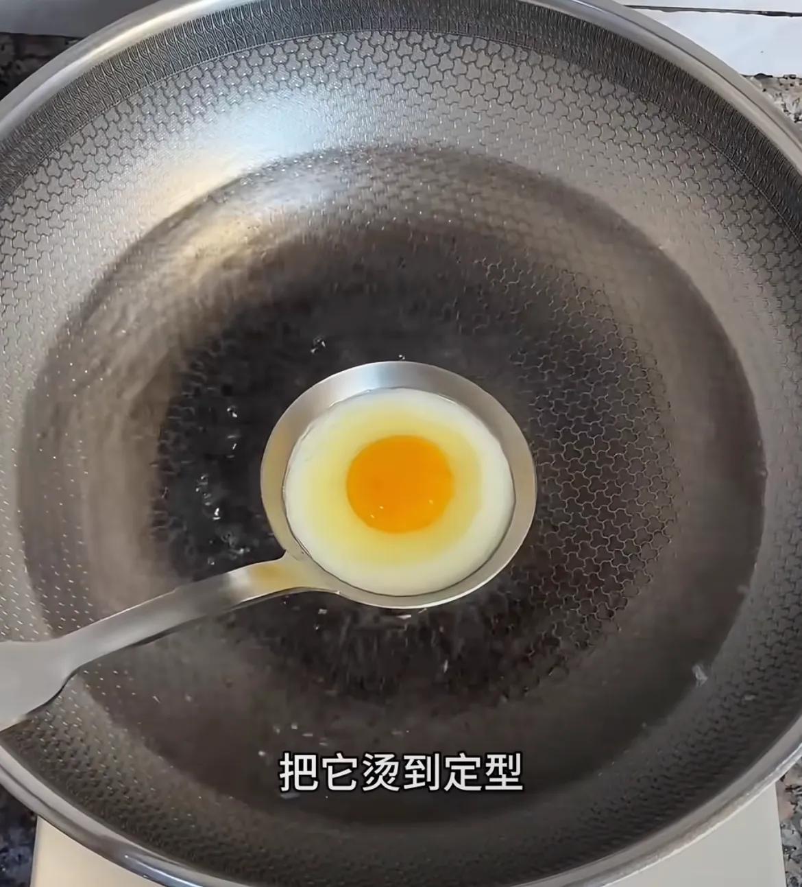 水燒開,飯勺先燙一分鐘,再刷層油防粘,然後把雞蛋輕輕打進去,隔水一燙,蛋白瞬間定型。