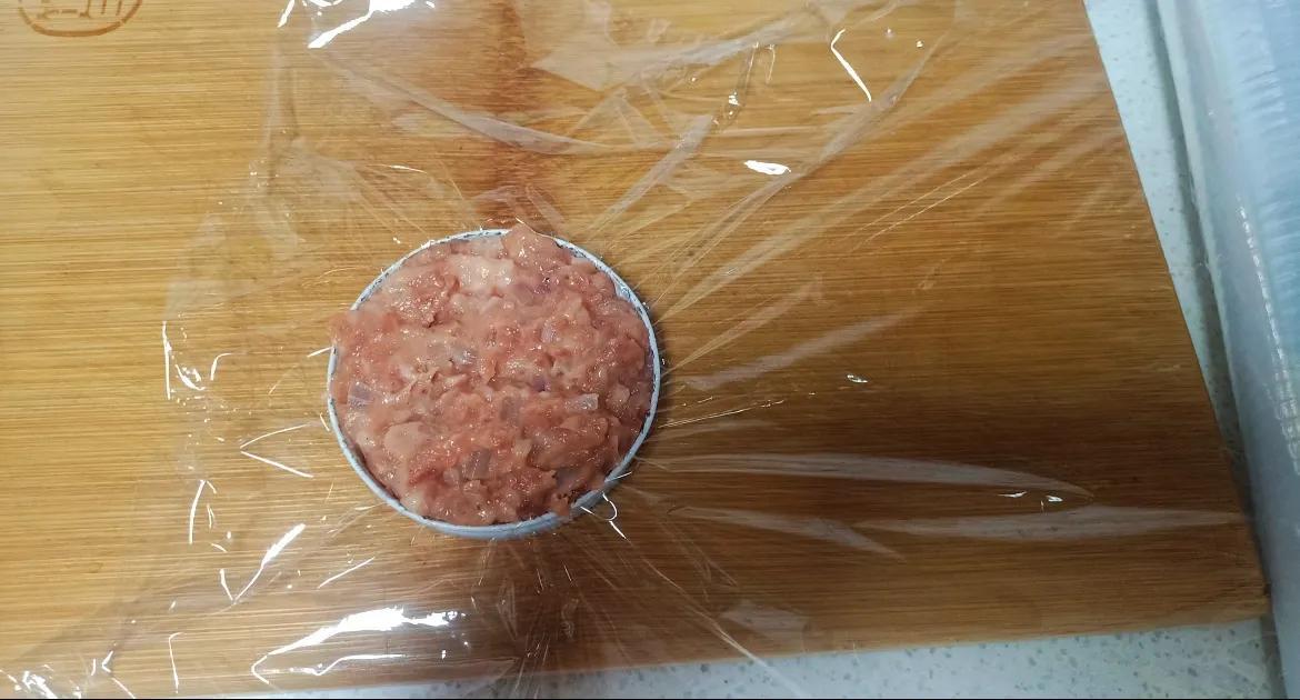 再做肉餅時,給瓶蓋裏先鋪保鮮膜防粘,再倒肉餡,只要壓平,就跟一個定向容器一樣,能把每個肉餅約束的同等大小,同樣圓滑。