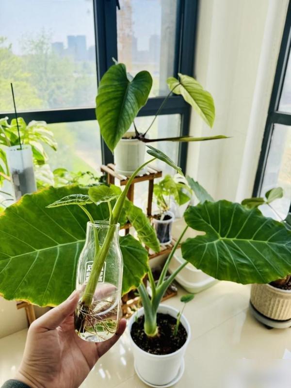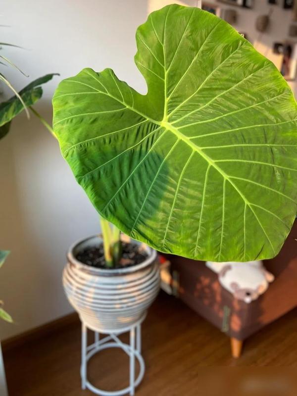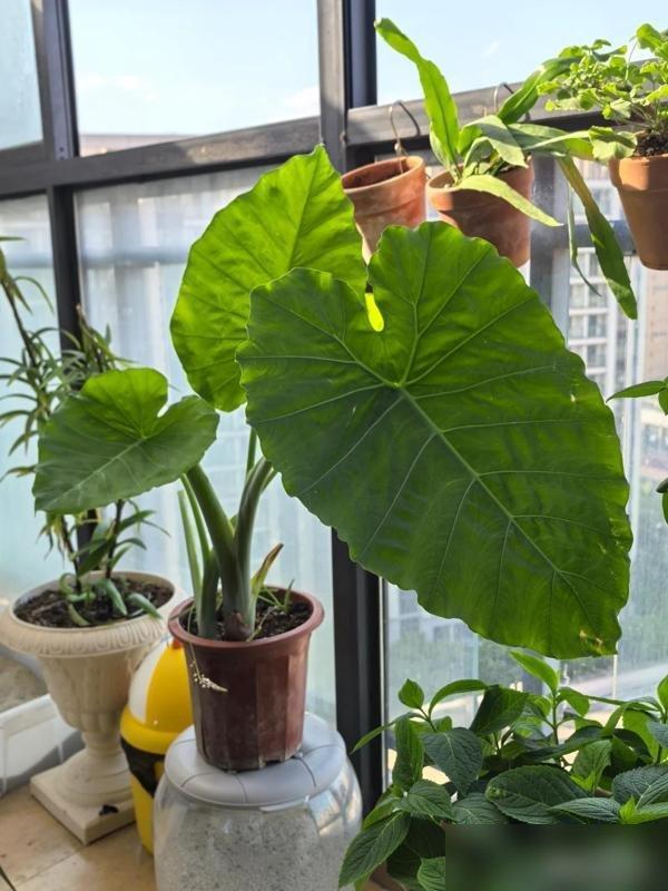 不過象耳芋也不是完全“不用管”,得摸準它的“小性子”。比如夏天別往太陽底下曬,我之前把它放陽臺欄杆上,結果第三天葉子邊緣就焦了,跟被火燒了似的,趕緊挪到樹蔭底下,噴了點水,過了一週又緩過來;澆水也得“懶”點——我媽之前天天給它澆水,結果根爛了,葉子全黃了,我趕緊把爛根剪掉,換了乾土,等土表面幹了再往下摳兩釐米,幹了才澆,現在又活蹦亂跳的;冬天更得注意,去年我家沒開暖氣,把它放客廳空調底下,溫度剛好16℃,它居然沒黃葉,還冒了片新葉,我媽說:“這孩子比我還會找舒服地方!”