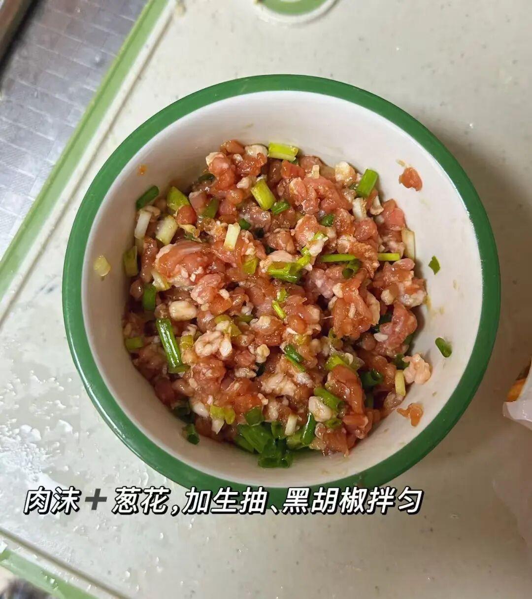 做肉餡很簡單,肉沫+蔥花,倒入適量生抽和胡椒粉拌勻。