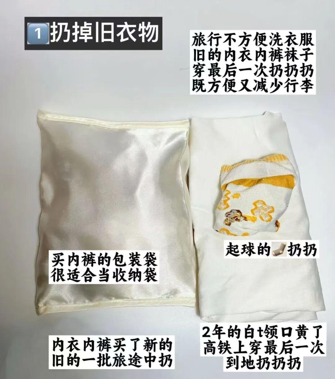 帶上那些快要用完的護膚品小樣、有點舊了但還能穿的內衣褲、或者攢了一堆的舊襪子。