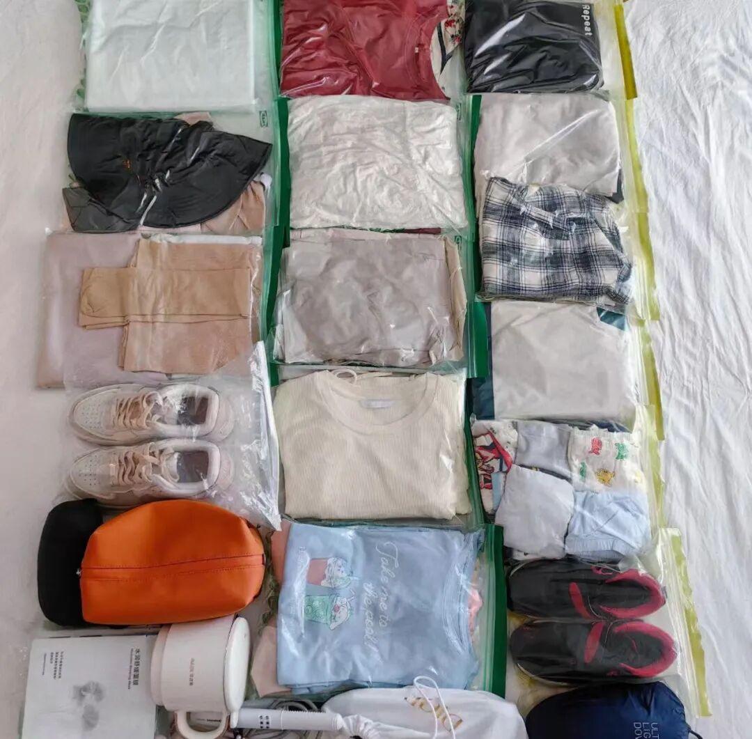 出發前,根據行程天數,不是胡亂塞一堆衣服,而是將上衣、褲子、內衣、襪子,甚至搭配的首飾,一套一套地完整搭配好。
