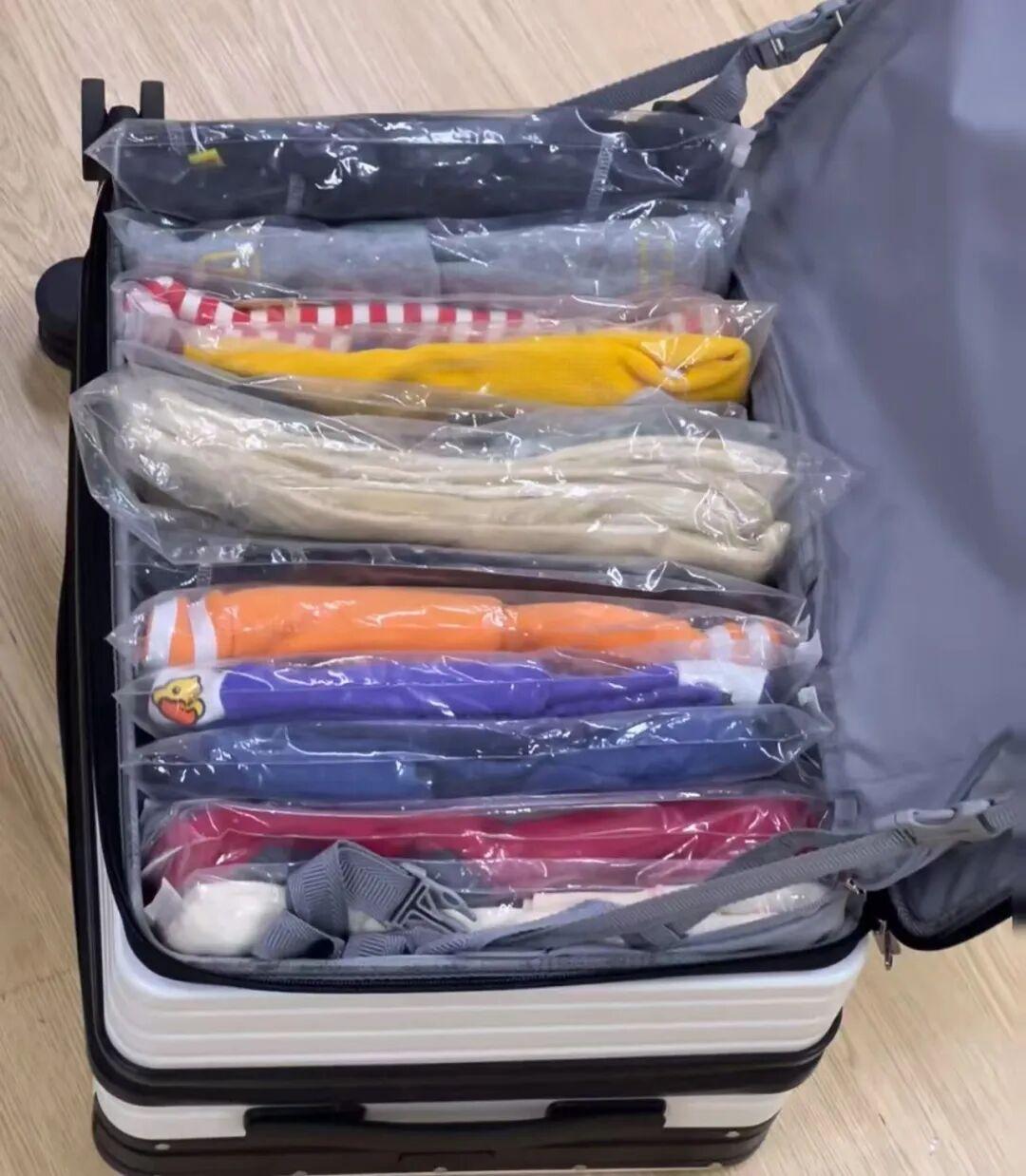 然後,將每一套衣服分別裝入一個透明的收納袋中。