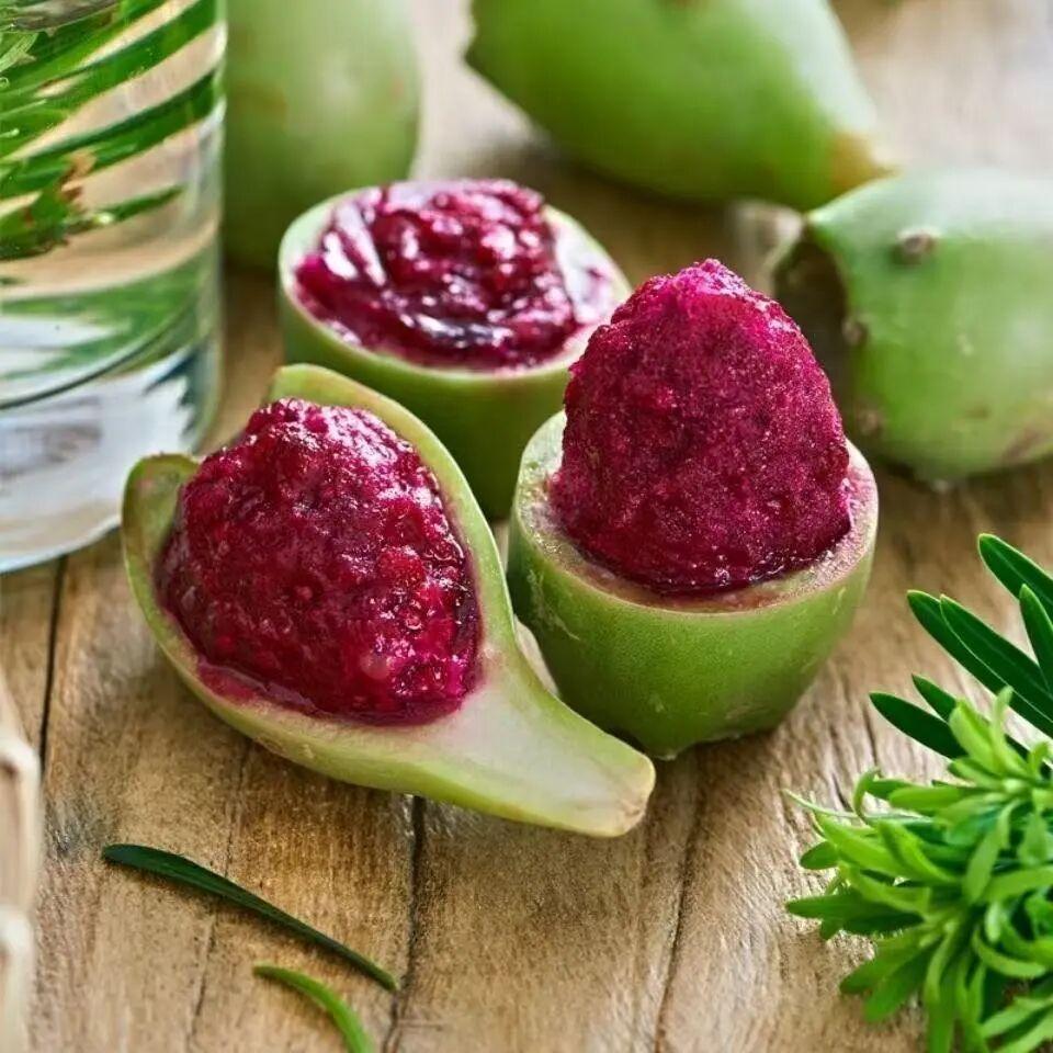 它就是海南仙人掌的果實,常見的紫紅色品種,切開後,果肉如同紅寶石般絢麗,喫起來卻很爽口。