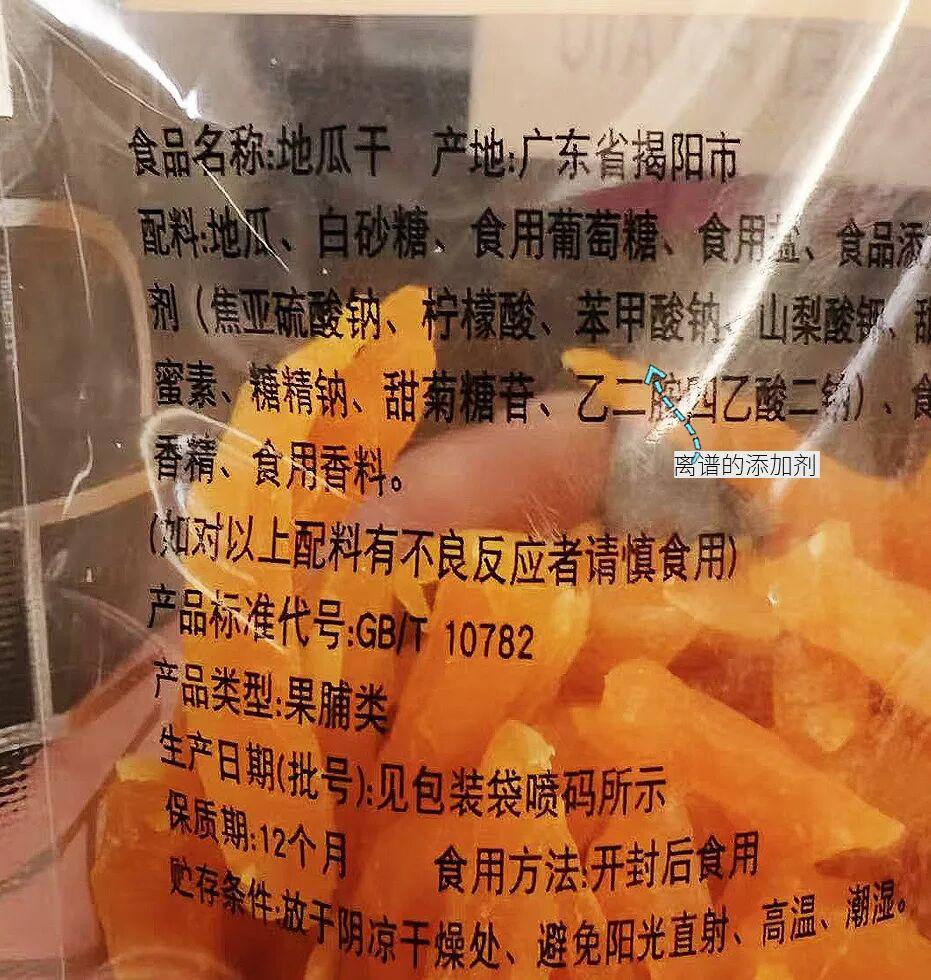 而我們當地的農村裏自己產的紅薯幹,也許是因爲小鄉鎮,沒那麼高的“科技狠活技術”,所以配料表乾淨的讓人心疼。