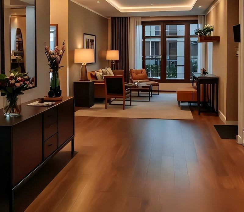他選的淺原木色,一進門就有股淡淡的木頭香,他拍着地板說:“這是鎖釦安裝,不用膠,裝完測甲醛只有0.02,比我家衣櫃還安全。”冬天開空調,地板摸着是溫溫的,娃光腳跑跳都不喊冷,上次娃摔了一跤,屁股着地居然沒哭,揉着屁股說:“地板軟軟的,不疼。”最讓我驚訝的是回南天——我們家瓷磚牆全是水珠,他發朋友圈曬客廳:“地板幹得能滑旱冰。”後來才知道,好的實木複合地板有“吸潮”功能,回南天能把空氣中的溼氣吸進去,比瓷磚還抗潮。