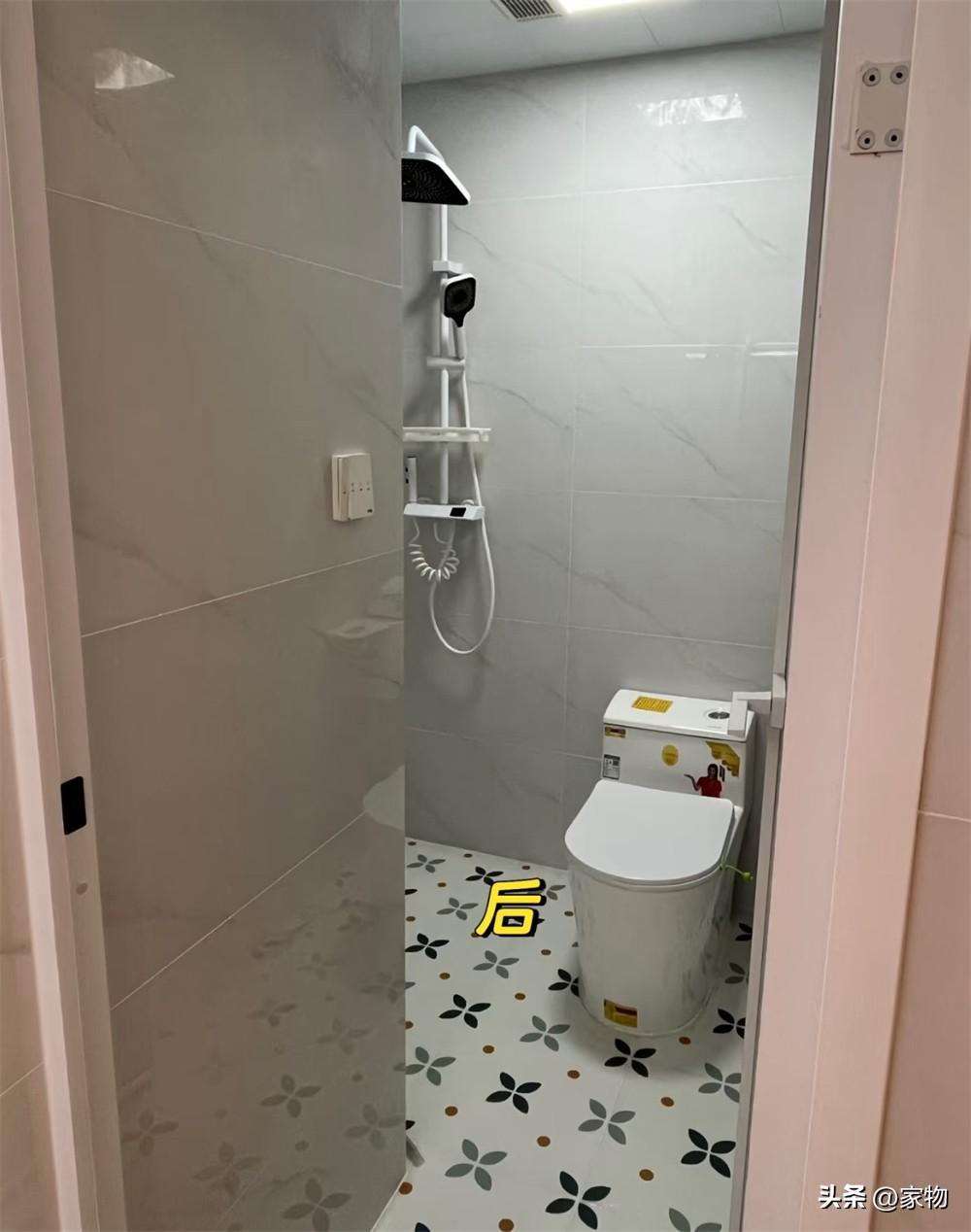 廚房盡頭已轉完,就是家裏的衛生間了,門扇正對馬桶,旁邊是淋浴花灑,再無其他空間,好在做了洗手檯外移的設計,不用擔心空間過於擁擠,這點相對來說還是挺不錯的。