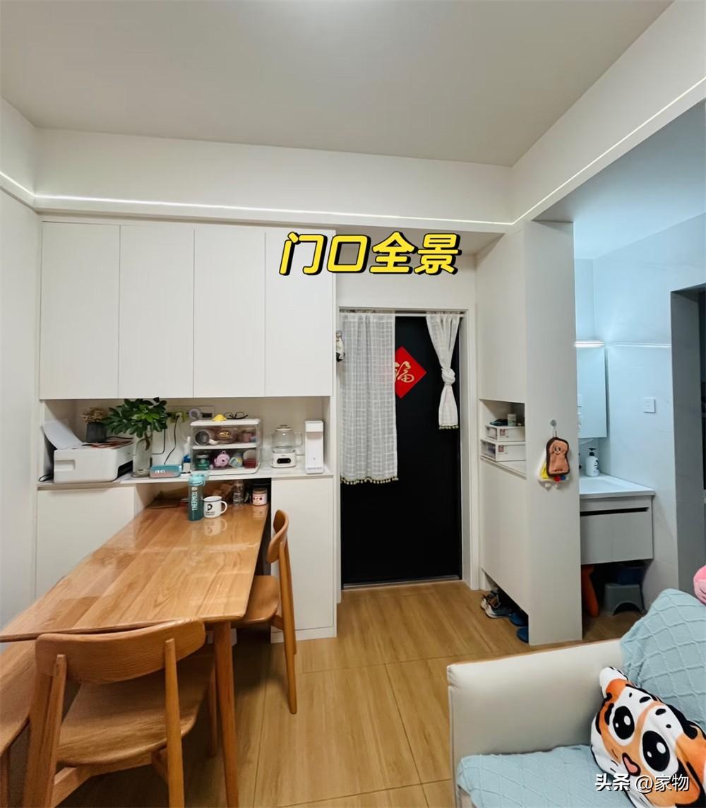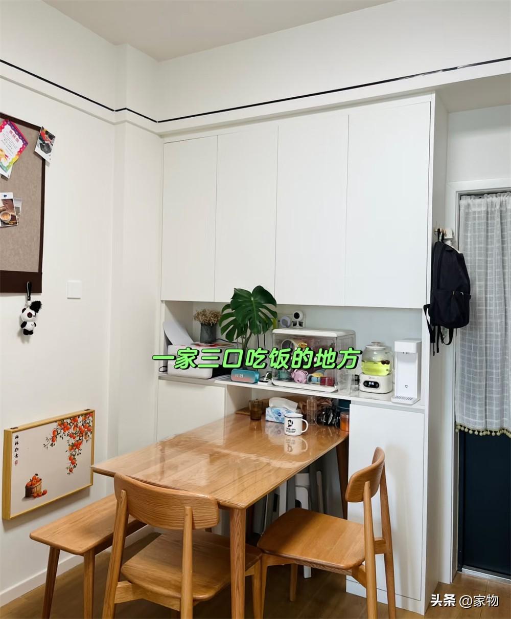 一家三口的餐桌,算是這位寶媽的得意之作,她在門口安裝三段式餐邊櫃,底部掏空櫃子收納餐桌,平日裏剛好坐下三口人,完全不覺得擁擠。