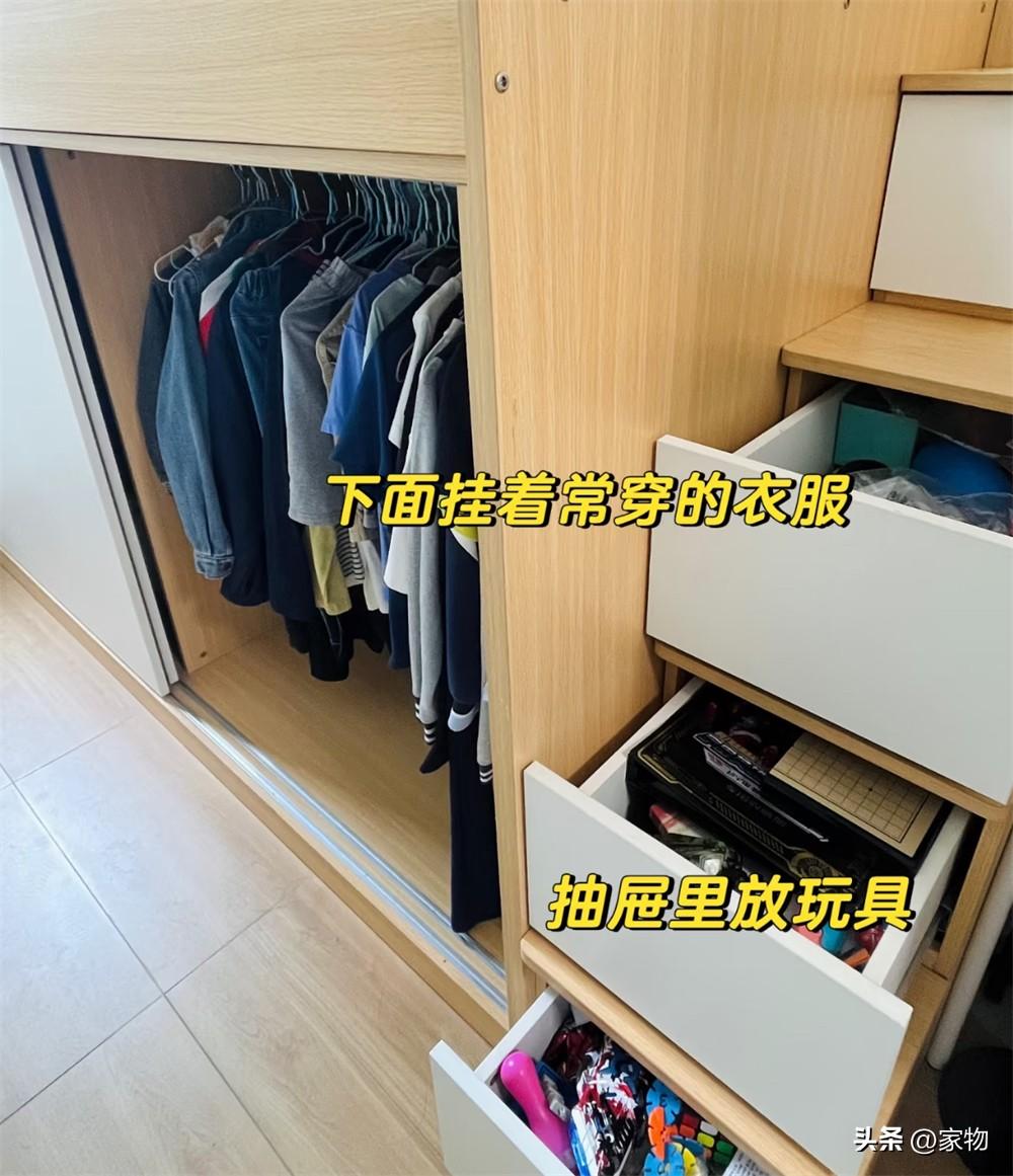 牀鋪下方掛着孩子經常穿的衣服,掛置收納拿取方便也不容易弄亂;樓梯抽屜裏,則放着各種玩具和雜物,隱藏收納讓家裏看起來更加整潔明快。