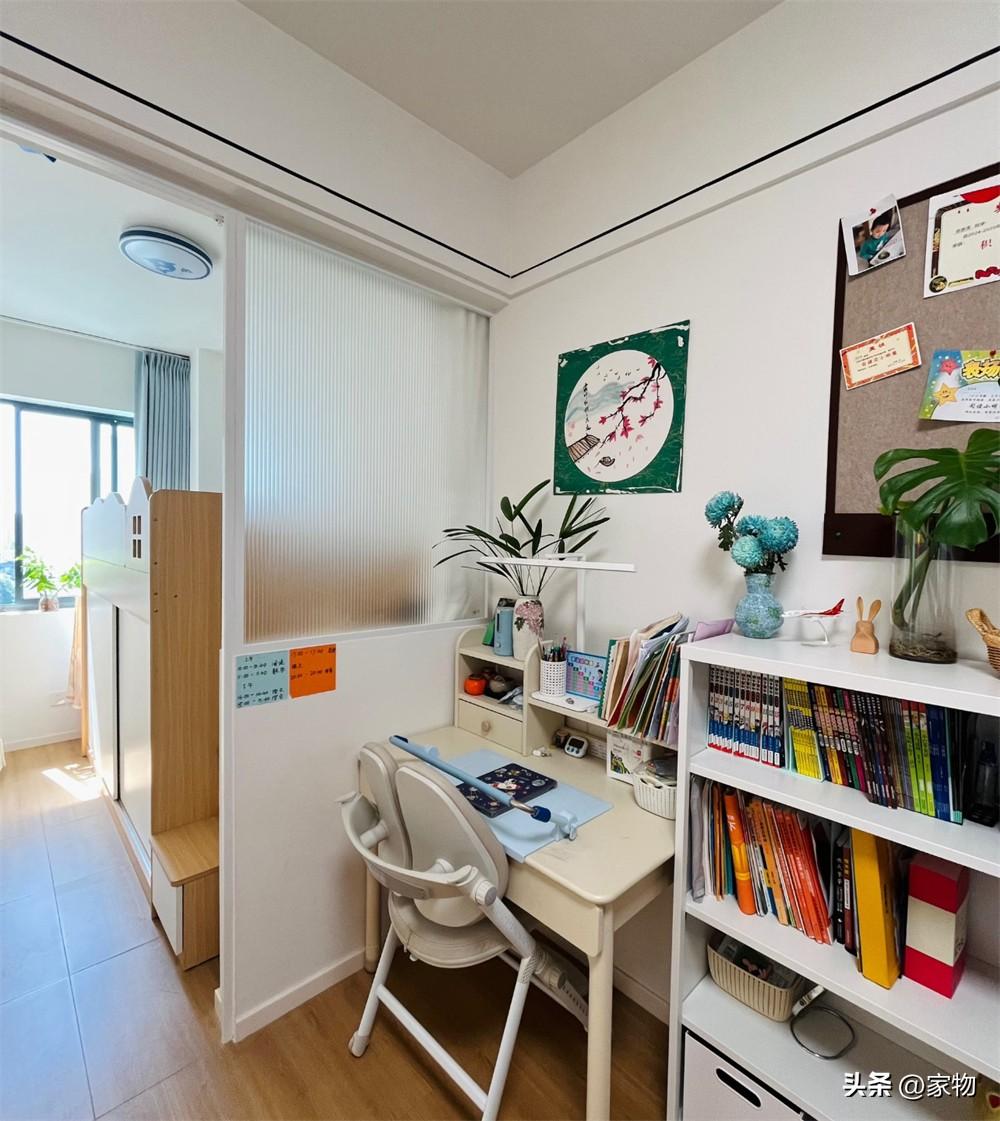 沙發對面,原本電視牆的位置現在改成了孩子的學習桌和書櫃,秉持着再苦不能苦孩子的理念,這處書桌空間其實並不擁擠,既有寫作業讀書的地方,又有收納教材和文具的空間,且挨着次臥室的內窗,採光也不算差,說起來還挺舒服的。