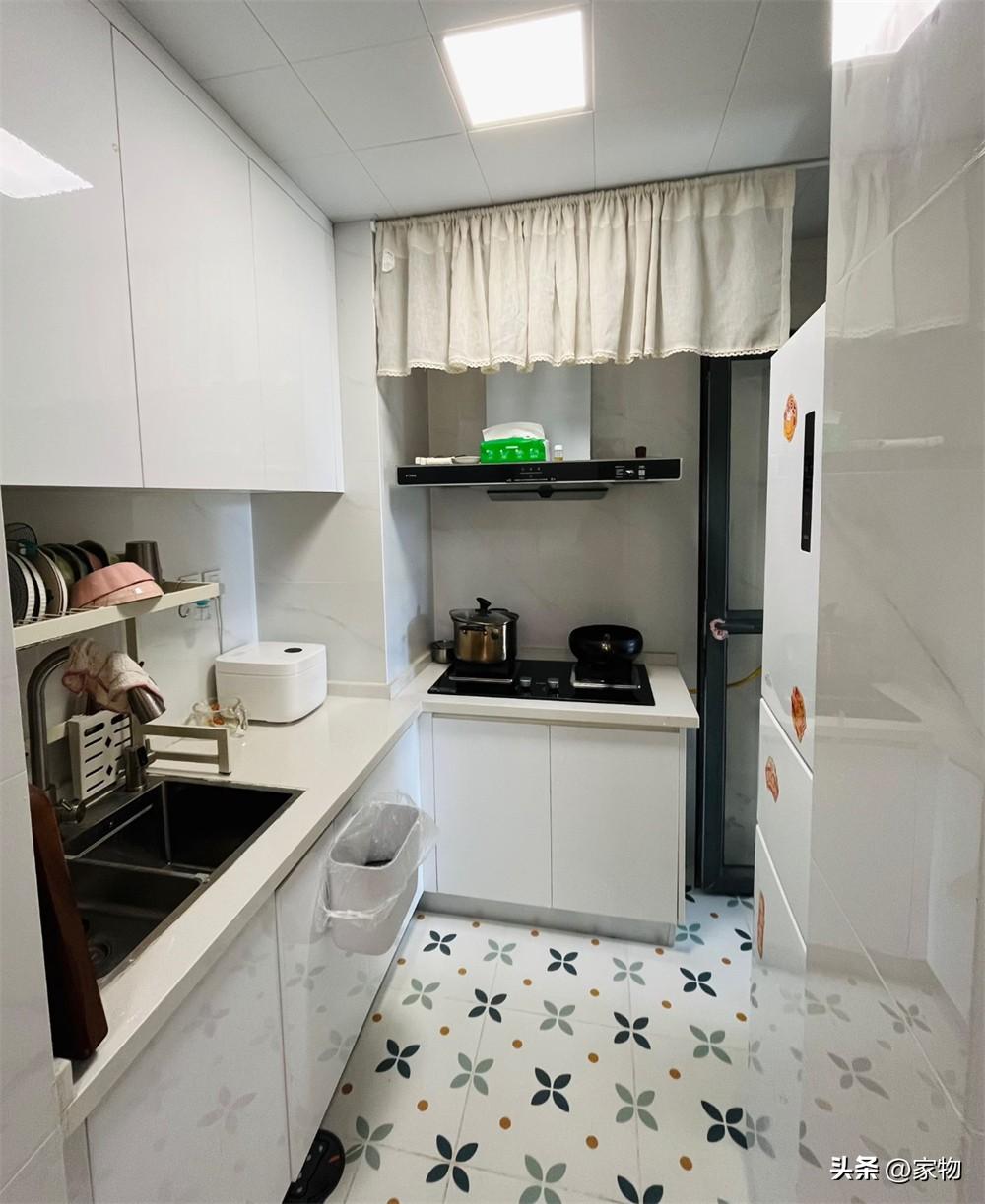 廚房內倒還算寬敞,即便沒有窗,也做了完整的L形櫥櫃,吊櫃和底櫃隱藏收納各種餐具廚具,檯面上也預留出了竈臺、水槽和足夠的切菜備菜空間,在這裏簡單做一家三口的飯菜絲毫沒有問題,收拾得也很是乾淨。