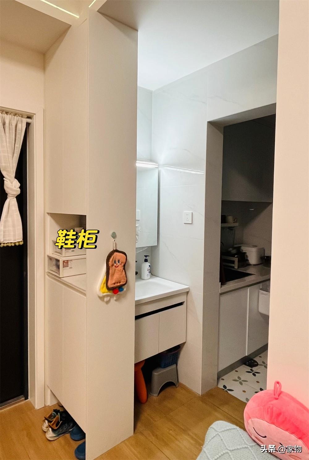 進門處的玄關很狹窄,原本是一個開放空間,旁邊就是廚房門,但現在做了一組鞋櫃隔斷,並將洗手檯挪到了廚房門外,打造出一個乾溼分離的入戶洗手池,回家後在櫃子一側置物換鞋,另一邊洗手洗臉,動線也很合理。