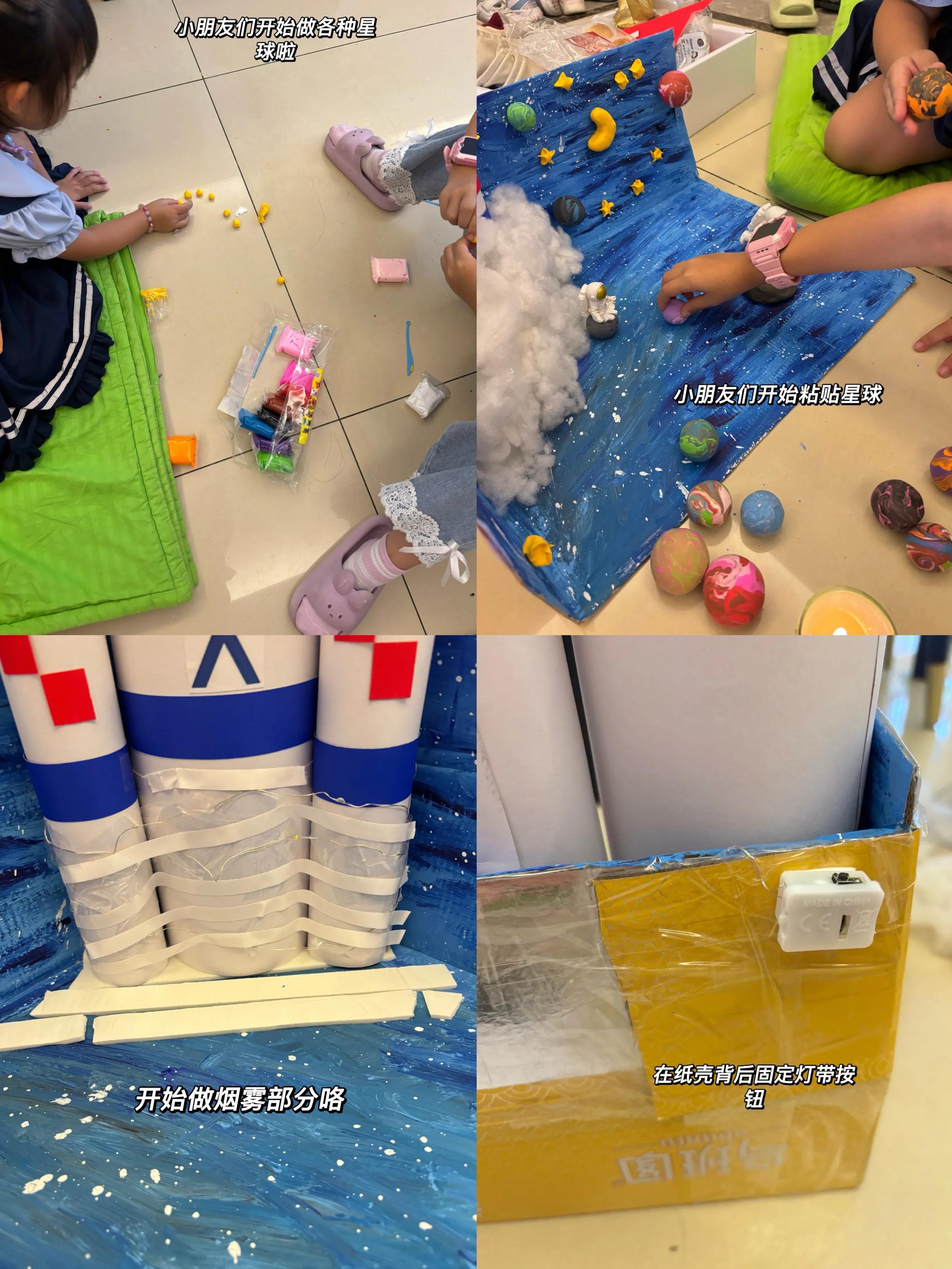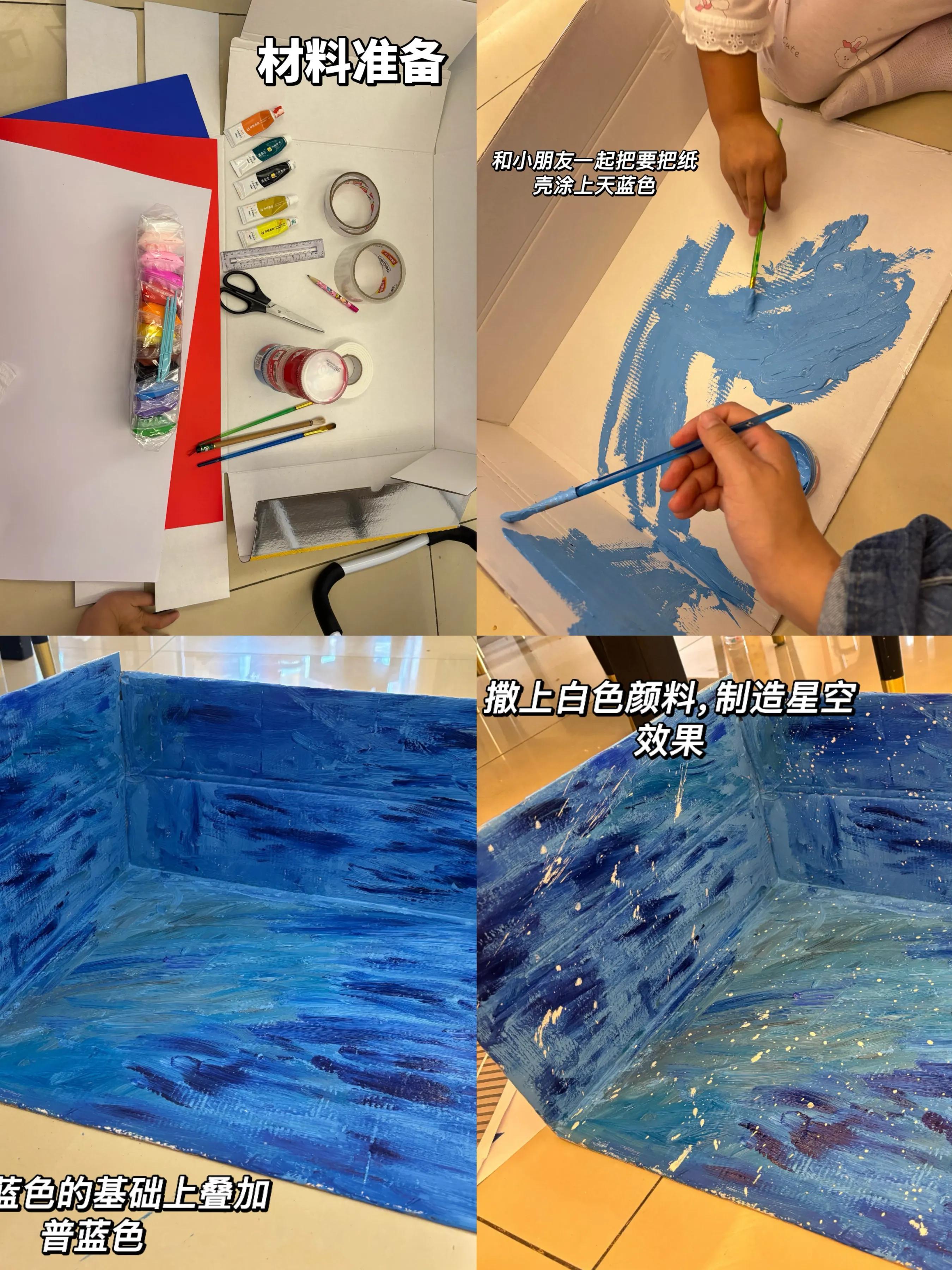 1.首先是用紙殼搭出一個太空背景板,然後讓小孩去給太空塗色,淺藍上可以疊加斑駁的深藍和白色,更能體現太空的深邃;
