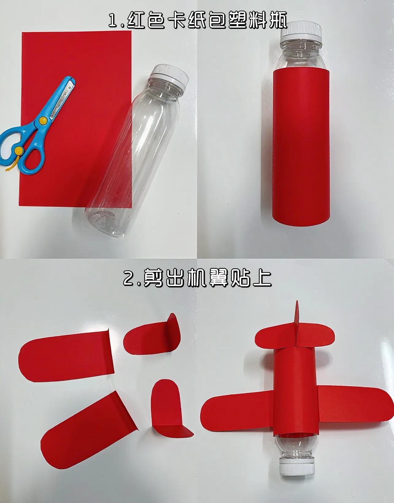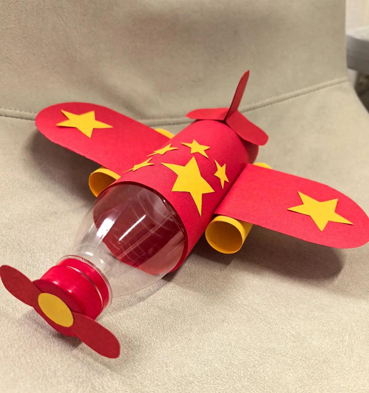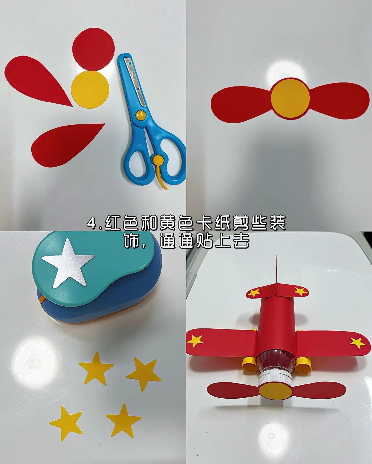 4.紅色、黃色卡紙齊上陣,剪出需要螺旋槳、五角星、貼在機身上,大功告成。
