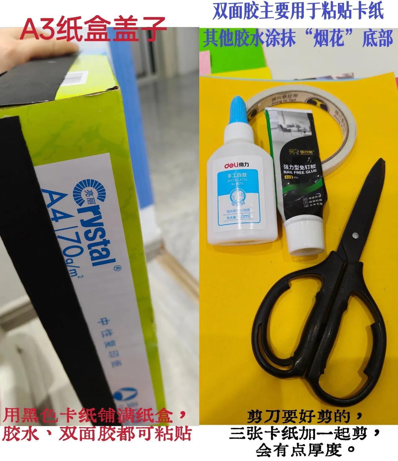 準備材料:A3紙盒蓋子(或者鞋盒)、雙面膠、卡紙、剪刀、膠水……
