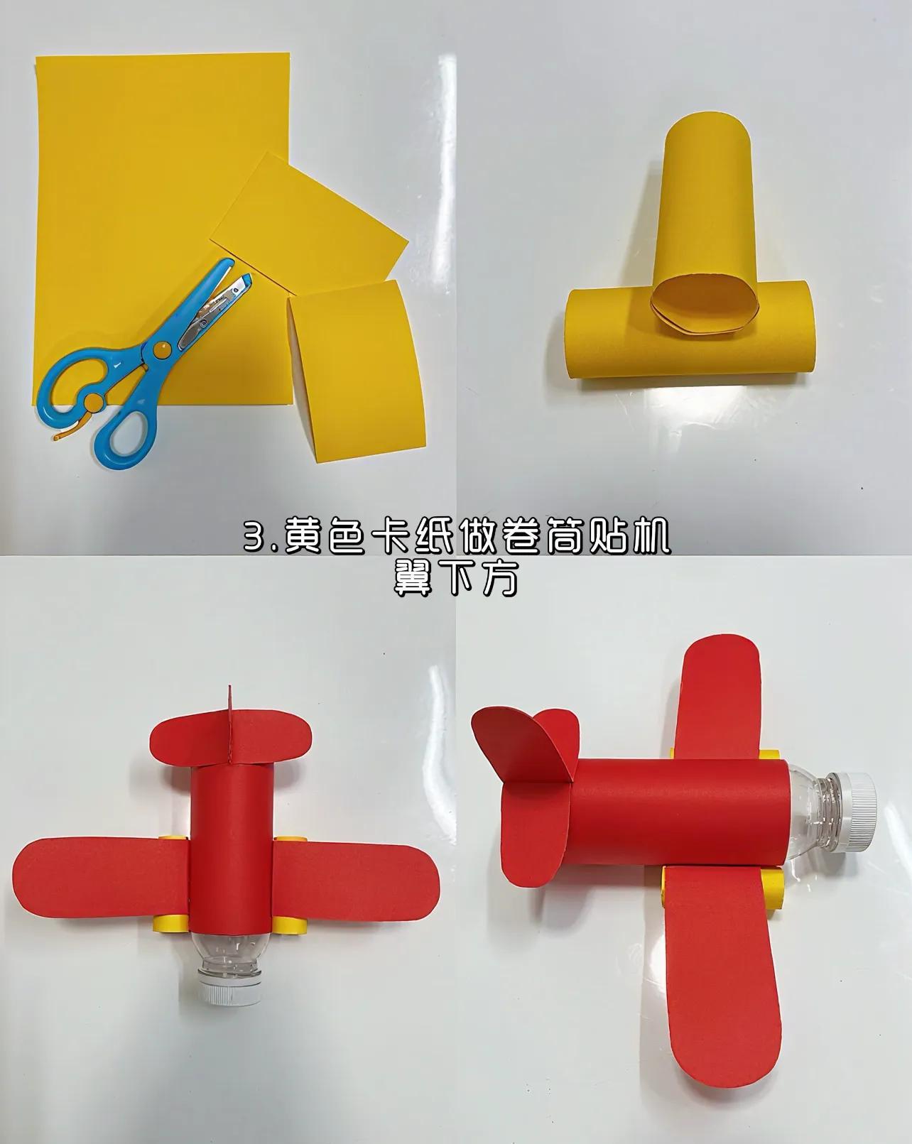 3.拿出黃色卡紙,捲成筒狀,做發動機,貼在機翼下方;