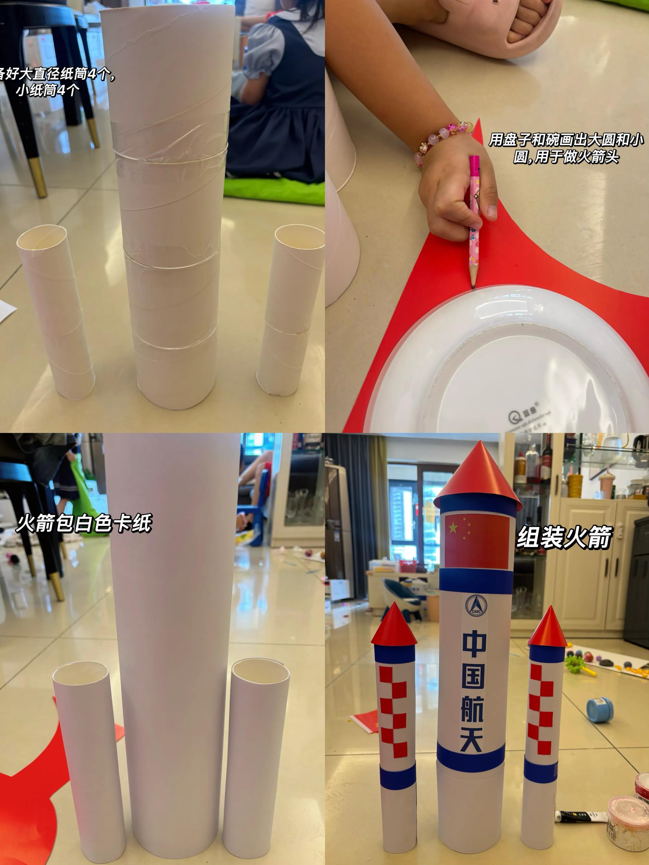 2.製造火箭,大圓桶紙殼上包白色卡紙,然後把卡紙剪成大圓盤、小圓盤當作火箭頭,最後再剪出中國航天標誌、字樣、裝飾,對火箭進行裝飾;