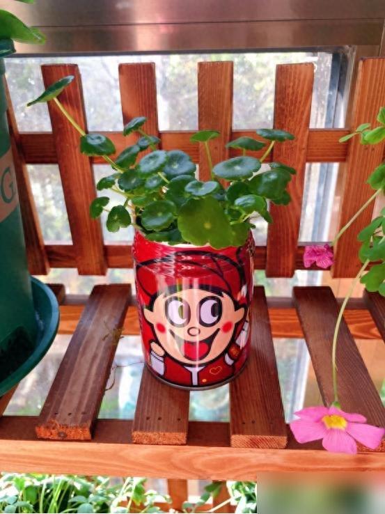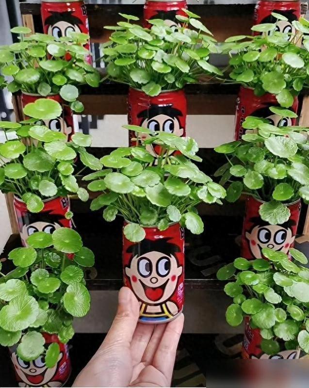 昨天刷到這個視頻時,我正抱着外賣盒啃炸雞,突然就放下筷子湊到屏幕前——陽臺架子上排得整整齊齊的旺仔罐,每個都頂着幾叢油綠的銅錢草,圓葉子像剛烙好的小餅,配着旺仔那紅撲撲的笑臉,活像一羣小朋友擠在一塊兒朝你笑,我隔着屏幕都忍不住跟着彎了嘴角。