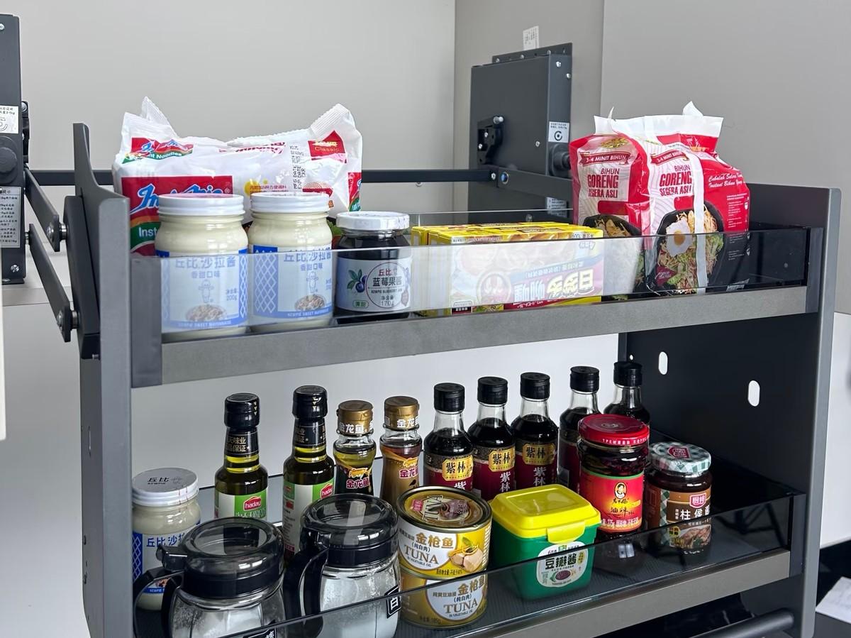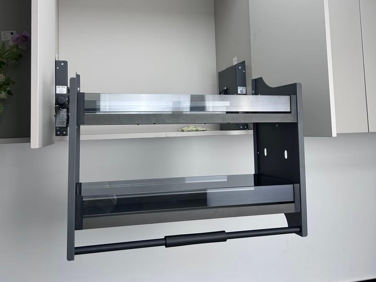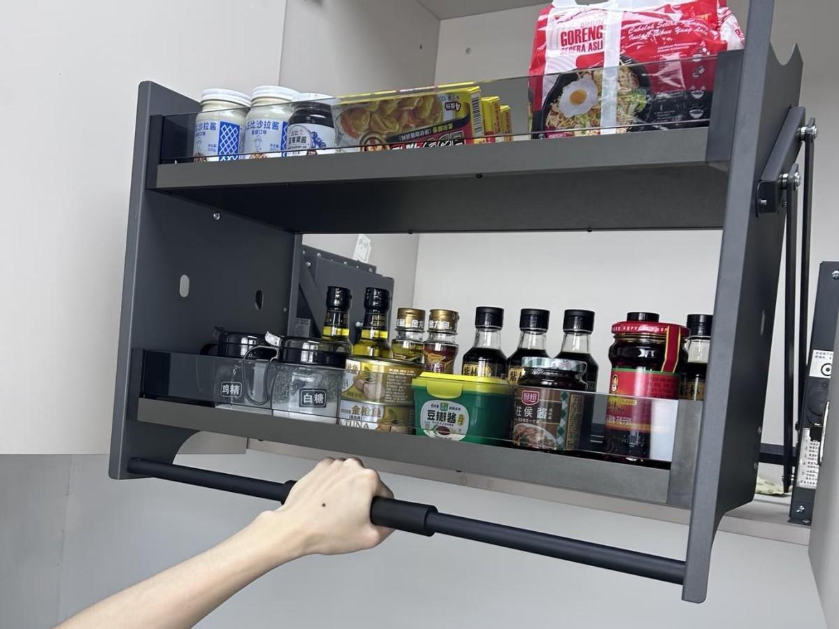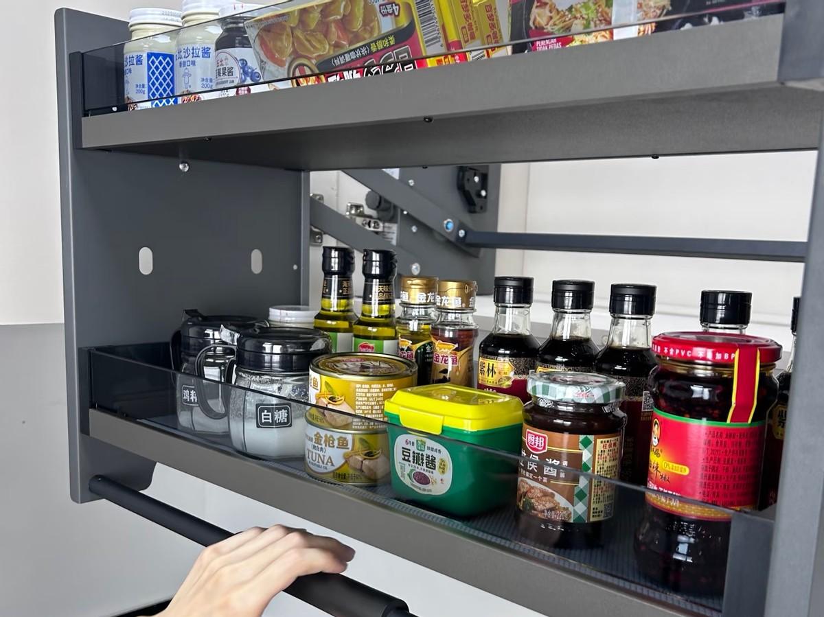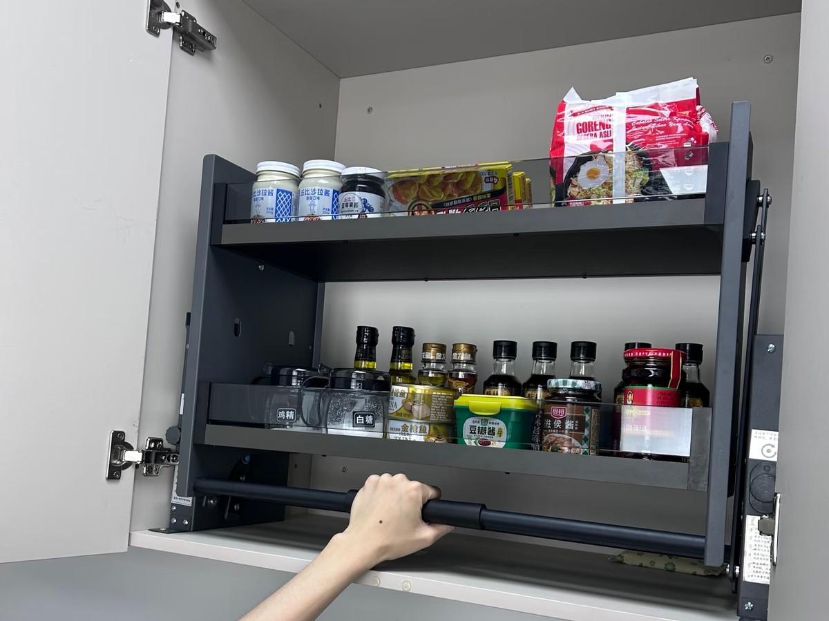 廚房下拉式吊櫃,解決了傳統吊櫃高處取物的困難。下拉過程中,櫃內的物品還可以保持穩定,不需要墊腳,輕鬆就可以拿取。
