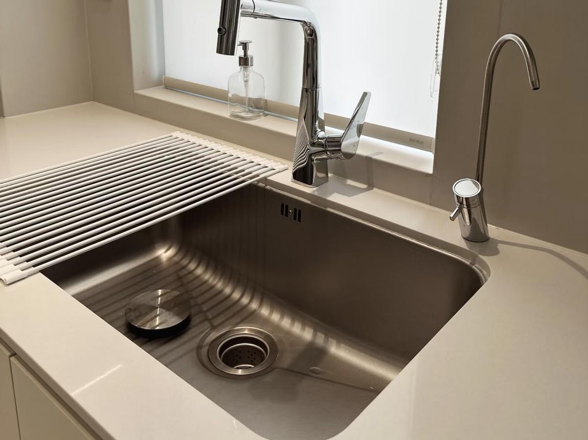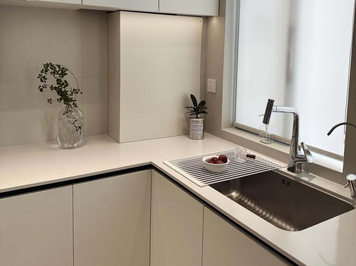 這次裝修,我家選擇的是5釐米厚的石英石臺面,厚度是挺厚的,而且放棄了傳統的下掛設計。讓檯面邊緣保持直角,稍微又做了一些倒角,能夠呈現出極薄的視覺效果。