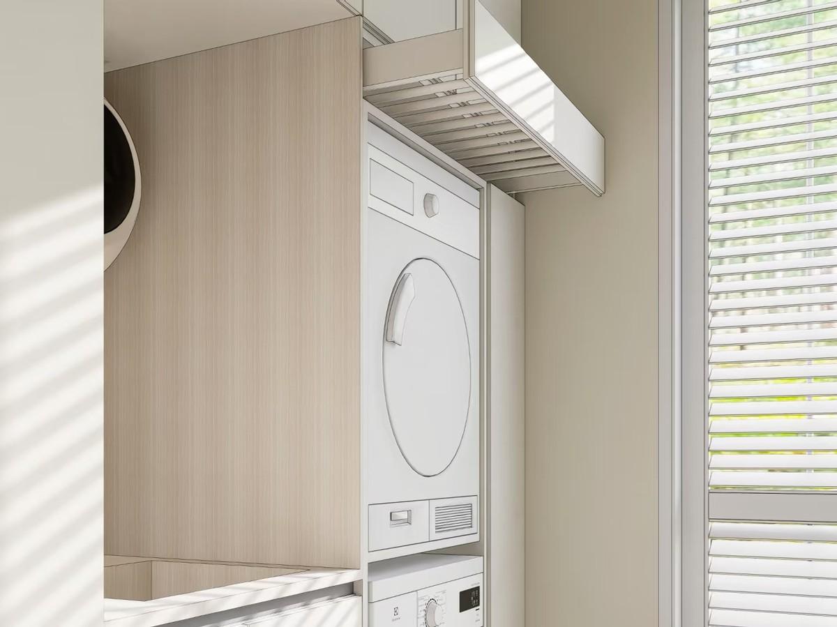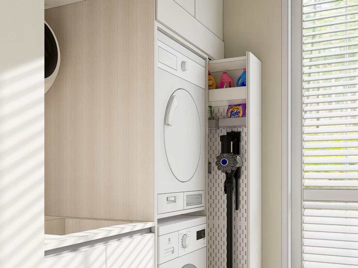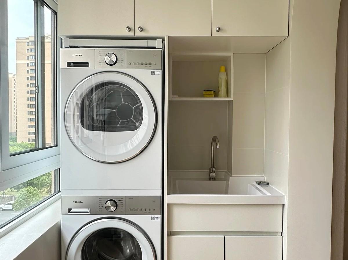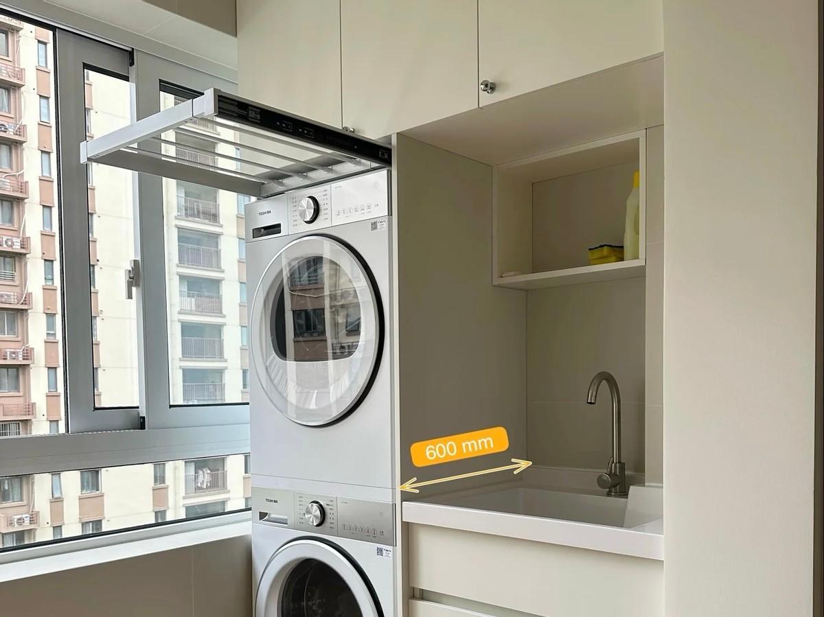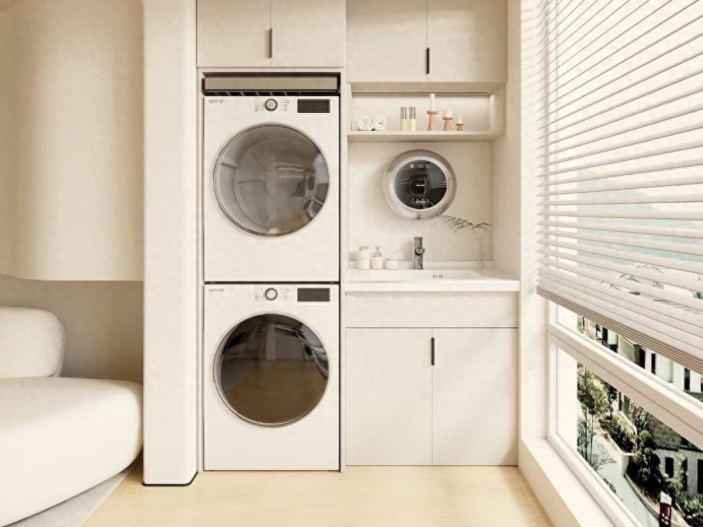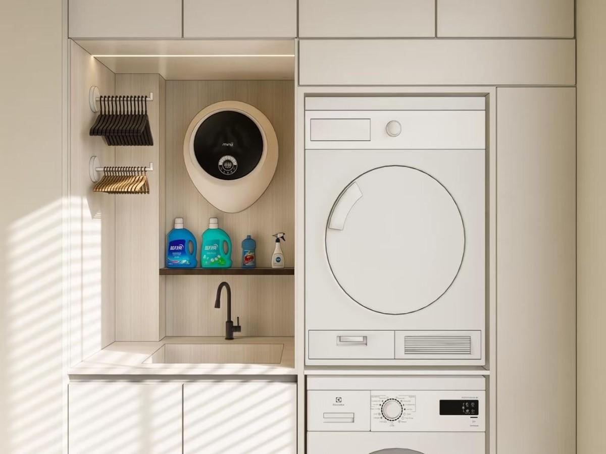 比較常規的做法就是上方可以設置推拉晾衣杆,下方可以隱藏洗衣機和水槽。