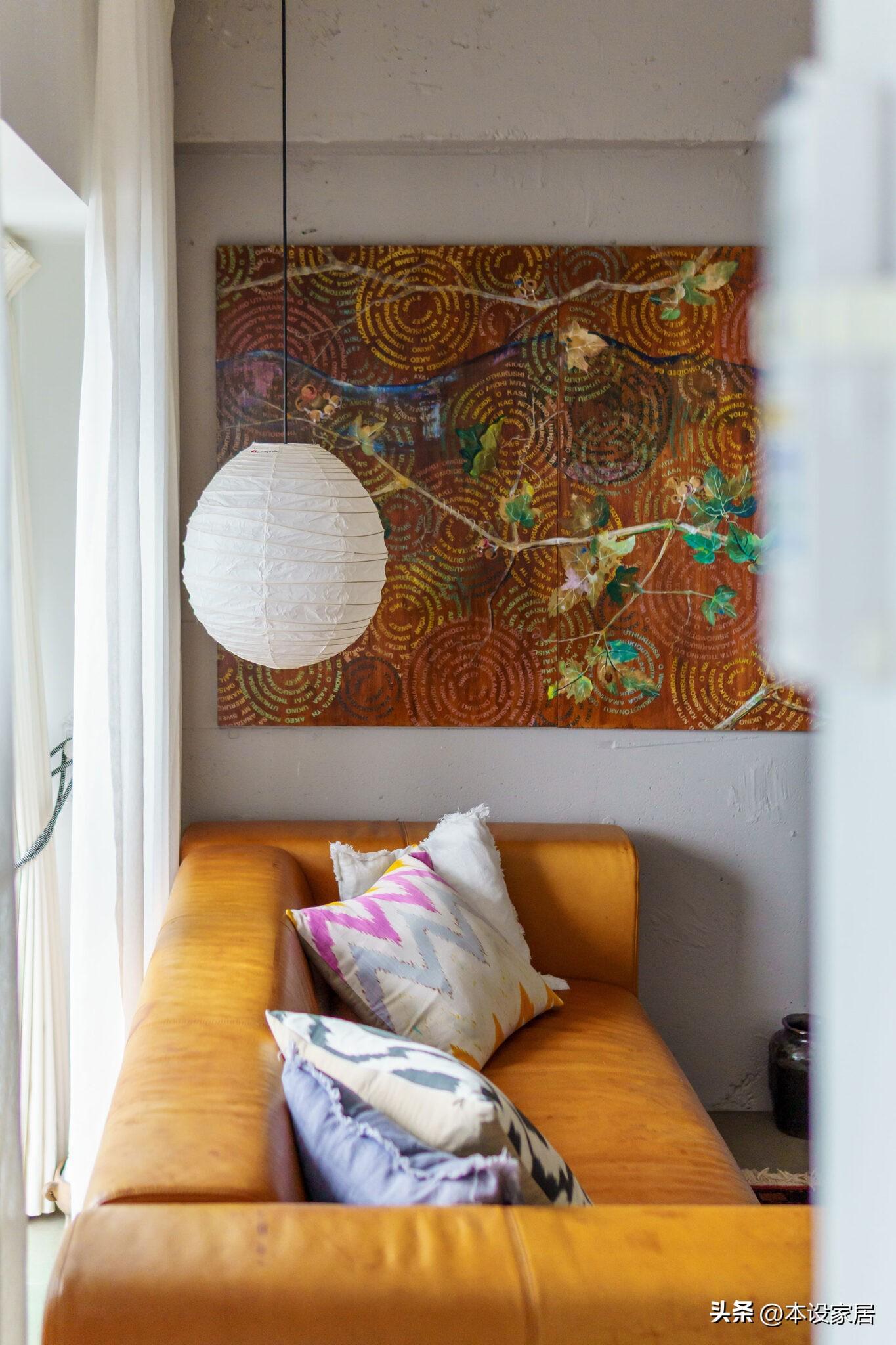 整體佈置以簡約爲主,選用橘色皮革沙發和白色布藝沙發進行搭配,乾淨清爽,再加上紅色拼花羊毛地毯和藝術畫的點綴,很有生活的氣息了。