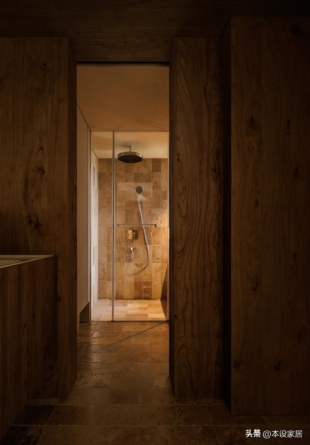 主臥門改由客廳沙發背面進入,老榆木移門與天花,以及衛生間區域互相穿插,形成連貫的結構美學,模糊了門與牆的邊界。
