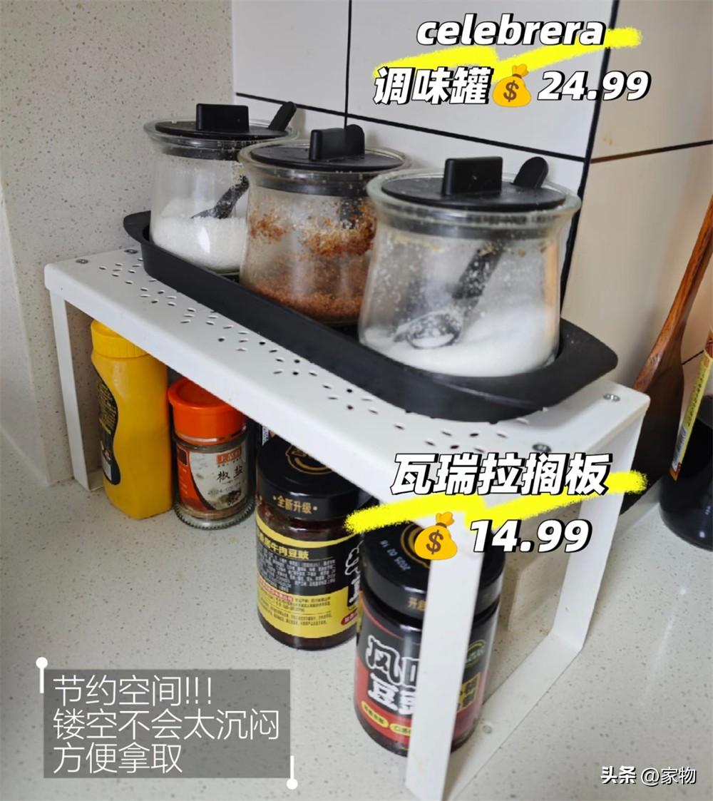 在這組調料瓶的下面我還安裝了一組架子,尺寸剛好隔出兩層,讓緊湊的廚房檯面空間利用率更高一些。